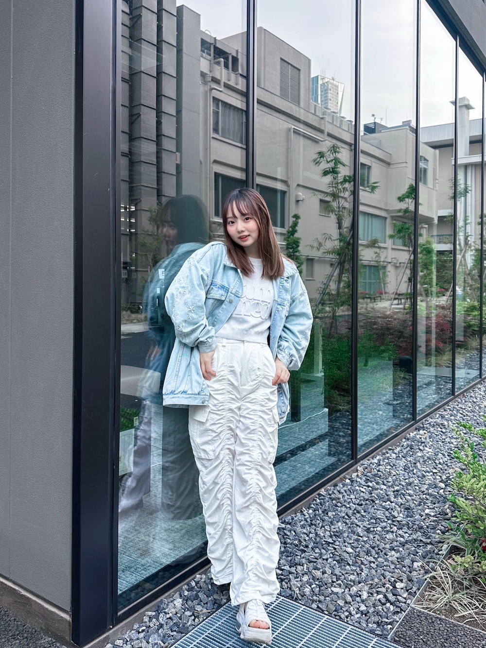 サンダルまだはやいかな?!笑 このアウターは高身長でもお尻まで隠れるように作られてるの!!!神! 中はどっちもホワイトだけど若干系統の違うホワイトを組み合わせることで抜け感🤍 全体的に明るい色で春って感じ!🩵☘️