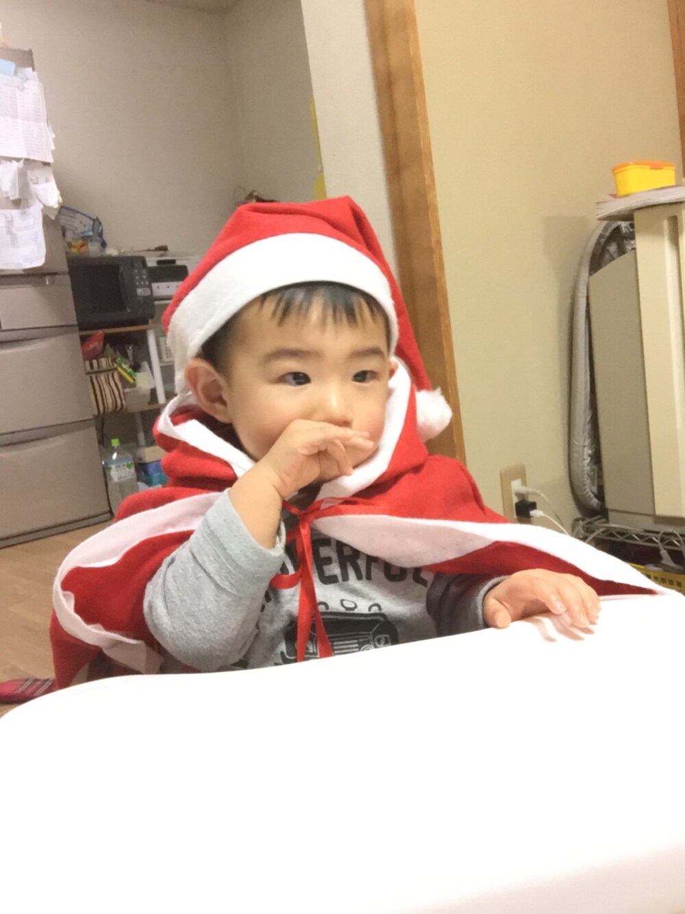 一足先早くクリパ。 去年買ったのを引っ張り出して 寝起きで風邪っぴき野郎に 無理矢理着せる。 写真撮ったら速攻で脱がせる。 また来年。
