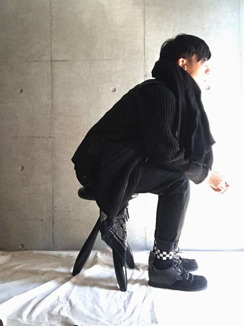 オールブラック何ですが、撮るの難しいなあ〜。オールブラックの時はモノトーンのUNUSEDのバンダナとかチェッカーで表情つけるか、オレンジやパープルで差すことが多いです○