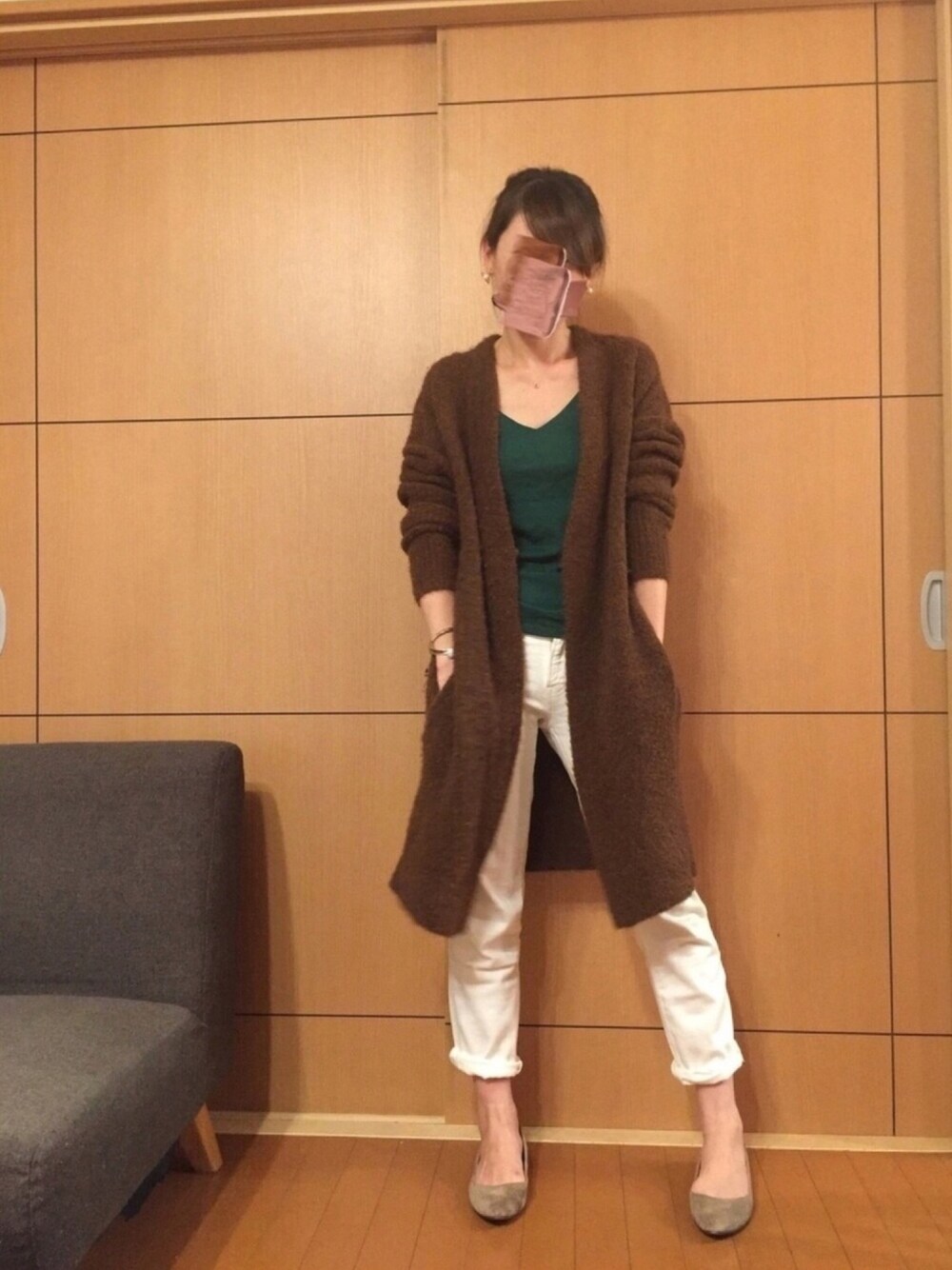 ブラウンのロングカーデ、アルパカが入ってて、めちゃあったかい♡ グリーンのキャミとの色合わせも、めちゃ可愛い☆