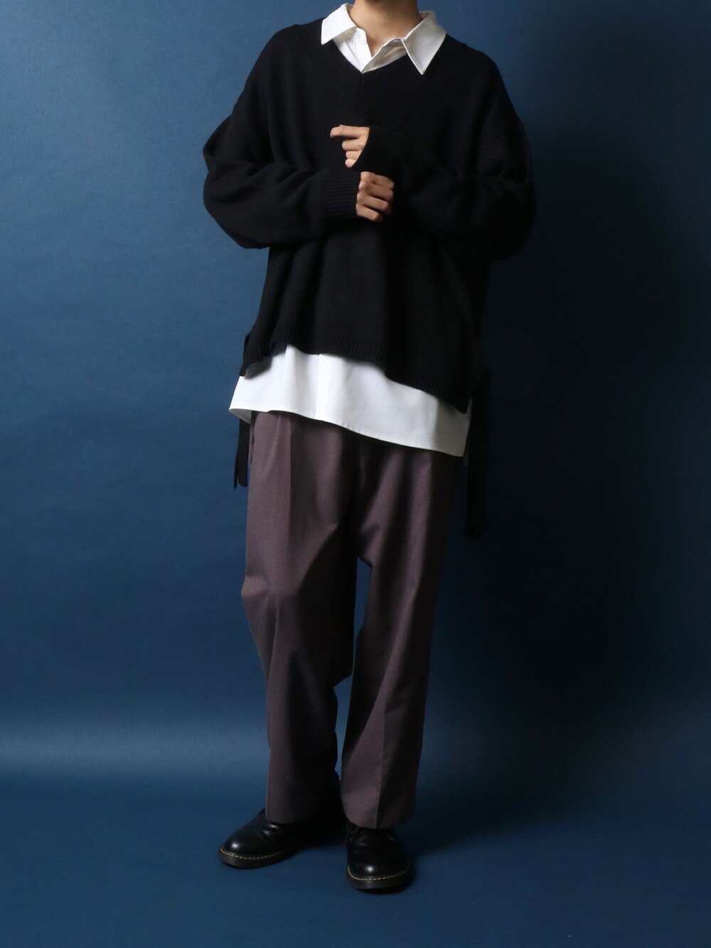ANPAS(ANPAS)のニット/セーター「Side Velt Wide Silhouette V-neck Knit Pullover/サイドベルト ワイドシルエット Vネック ニットプルオーバー セーター」を使ったコーディネート