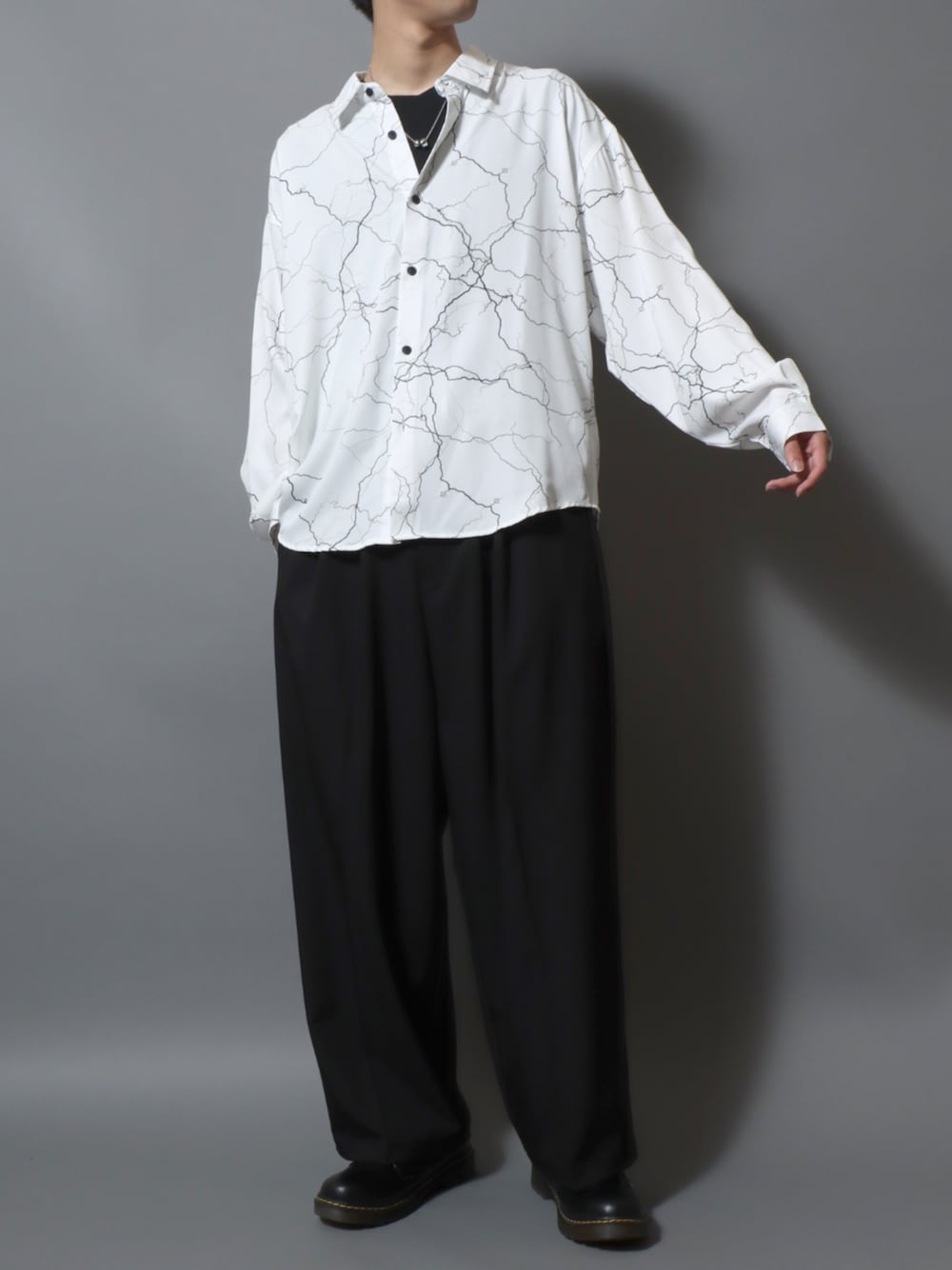【All‑over patterned georgette fluid shirt/ジョーゼット とろみ 総柄長袖シャツ 柄シャツ メンズ ペイズリー/フラワー/幾何学/レトロ/モノトーン】 <Fabric> タテ糸・ヨコ糸に強く撚りをかけた糸を使い平織りにした、細かなシボ(凹凸)と透け感が特徴の「ジョーゼット・クレープ」生地。 軽くて柔らかい肌触りの良いポリエステルでシワになりにくくドレープ性がありエレガントな印象を与えます。 伸縮性があり、さらりとした生地感ととろみ感が快適な着心地で、表面感のあるマットなジョーゼット素材がレトロなグラフィックとの相性◎。 <Design/Silhouette> 抽象的なグラフィックやペイズリー柄が古着ヴィンテージ感・アンティーク感を醸し出し、モードなスタイリングを作り出します。 花柄やバタフライ柄、幾何学柄はキレイめから韓国ストリートのスタイリングにも好相性。 程よい光沢感に加え自然なドレープ感がより上品な印象を与えてくれるので一枚で着ても様になります。 オーバーサイズのワイドシルエットが旬なスタイリングを作り出しユニセックスとしてもお使いいただけます。 【全25柄展開】 ホワイト系1:ダークフラワーホワイト ブラック系1:ダークフラワーブラック ブラウン系1:ペイズリーブラウン ブラウン系2アンティークブラウン ホワイト系2:バタフライホワイト ホワイト系3:幾何学ホワイト アイボリー系1:ガールアイボリー ブラック系2:ノスタルジックブラック アイボリー系2:ノスタルジックアイボリー ブラック系3:ダークフラワーレッド ライトグレー系1:アブストラクトネイビー グレー系1:アブストラクトブラック ホワイト系4:フォトフラワーホワイト ブラック系4:フォトフラワーブラック ホワイト系5:ライトニングホワイト ダークグリーン系1:ペイズリーブラウン ダークグリーン系2:ペイズリーブラック ホワイト系6:フォトバタフライホワイト ブラック系5:フォトバタフライブラック ダークブラウン系1:クラシックペイズリーブラック ダークブラウン系2:クラシックペイズリーグレー ダークブラウン系3:レオパードブラウン ダークブラウン系4:レオパードブラック ベージュ系1:ペイズリーダークベージュ ベージュ系2:アンティークベージュ <Styling> テーラードジャケットやコーチジャケット、ミリタリージャケットにコートなどどんなアウターとも相性抜群です。 オーバーサイズの着用で全体的にゆるく着こなす人気のゆるふわキレイめスタイルがおすすめです。 ワイドパンツやスラックスなどと合わせて、全体的にゆるく着こなした人気の80~90's古着スタイルもGOOD。 カーゴパンツやジョガーパンツにスニーカーを合わせるとスポーツ、ストリートスタイルに。 デニムやチノパン、ワイドパンツに合わせるとカジュアルスタイルに、さらにローファーやブーツなどの革靴を合わせると上品な大人なスタイルに。 トートバッグやバックパック、キャップやバケットハット、サングラスやアクセサリーなどいろんな小物とも相性抜群です。 メンズ、レディースともに着用できるユニセックスモデルで、カップルコーデや友達同士のペアコーデにもおすすめです。