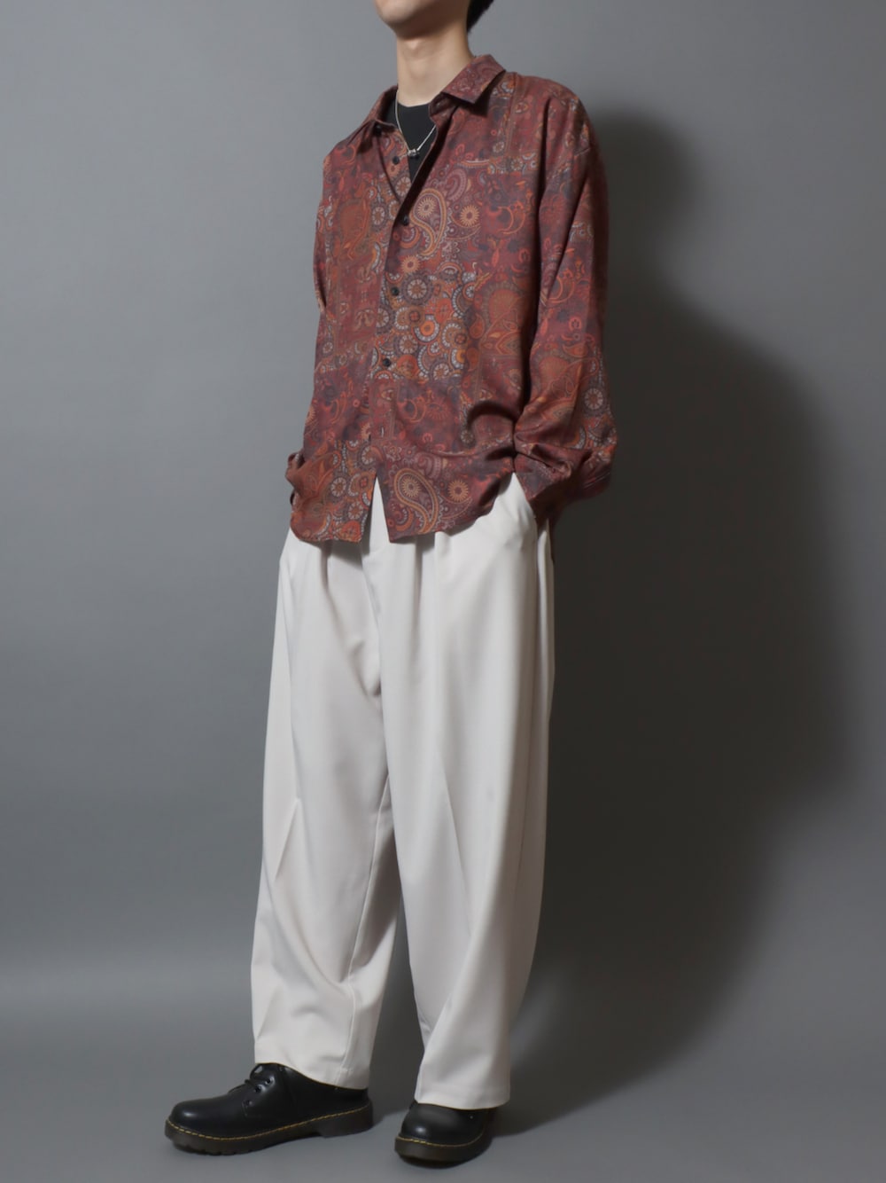 【All‑over patterned georgette fluid shirt/ジョーゼット とろみ 総柄長袖シャツ 柄シャツ メンズ ペイズリー/フラワー/幾何学/レトロ/モノトーン】 <Fabric> タテ糸・ヨコ糸に強く撚りをかけた糸を使い平織りにした、細かなシボ(凹凸)と透け感が特徴の「ジョーゼット・クレープ」生地。 軽くて柔らかい肌触りの良いポリエステルでシワになりにくくドレープ性がありエレガントな印象を与えます。 伸縮性があり、さらりとした生地感ととろみ感が快適な着心地で、表面感のあるマットなジョーゼット素材がレトロなグラフィックとの相性◎。 <Design/Silhouette> 抽象的なグラフィックやペイズリー柄が古着ヴィンテージ感・アンティーク感を醸し出し、モードなスタイリングを作り出します。 花柄やバタフライ柄、幾何学柄はキレイめから韓国ストリートのスタイリングにも好相性。 程よい光沢感に加え自然なドレープ感がより上品な印象を与えてくれるので一枚で着ても様になります。 オーバーサイズのワイドシルエットが旬なスタイリングを作り出しユニセックスとしてもお使いいただけます。 【全25柄展開】 ホワイト系1:ダークフラワーホワイト ブラック系1:ダークフラワーブラック ブラウン系1:ペイズリーブラウン ブラウン系2アンティークブラウン ホワイト系2:バタフライホワイト ホワイト系3:幾何学ホワイト アイボリー系1:ガールアイボリー ブラック系2:ノスタルジックブラック アイボリー系2:ノスタルジックアイボリー ブラック系3:ダークフラワーレッド ライトグレー系1:アブストラクトネイビー グレー系1:アブストラクトブラック ホワイト系4:フォトフラワーホワイト ブラック系4:フォトフラワーブラック ホワイト系5:ライトニングホワイト ダークグリーン系1:ペイズリーブラウン ダークグリーン系2:ペイズリーブラック ホワイト系6:フォトバタフライホワイト ブラック系5:フォトバタフライブラック ダークブラウン系1:クラシックペイズリーブラック ダークブラウン系2:クラシックペイズリーグレー ダークブラウン系3:レオパードブラウン ダークブラウン系4:レオパードブラック ベージュ系1:ペイズリーダークベージュ ベージュ系2:アンティークベージュ <Styling> テーラードジャケットやコーチジャケット、ミリタリージャケットにコートなどどんなアウターとも相性抜群です。 オーバーサイズの着用で全体的にゆるく着こなす人気のゆるふわキレイめスタイルがおすすめです。 ワイドパンツやスラックスなどと合わせて、全体的にゆるく着こなした人気の80~90's古着スタイルもGOOD。 カーゴパンツやジョガーパンツにスニーカーを合わせるとスポーツ、ストリートスタイルに。 デニムやチノパン、ワイドパンツに合わせるとカジュアルスタイルに、さらにローファーやブーツなどの革靴を合わせると上品な大人なスタイルに。 トートバッグやバックパック、キャップやバケットハット、サングラスやアクセサリーなどいろんな小物とも相性抜群です。 メンズ、レディースともに着用できるユニセックスモデルで、カップルコーデや友達同士のペアコーデにもおすすめです。