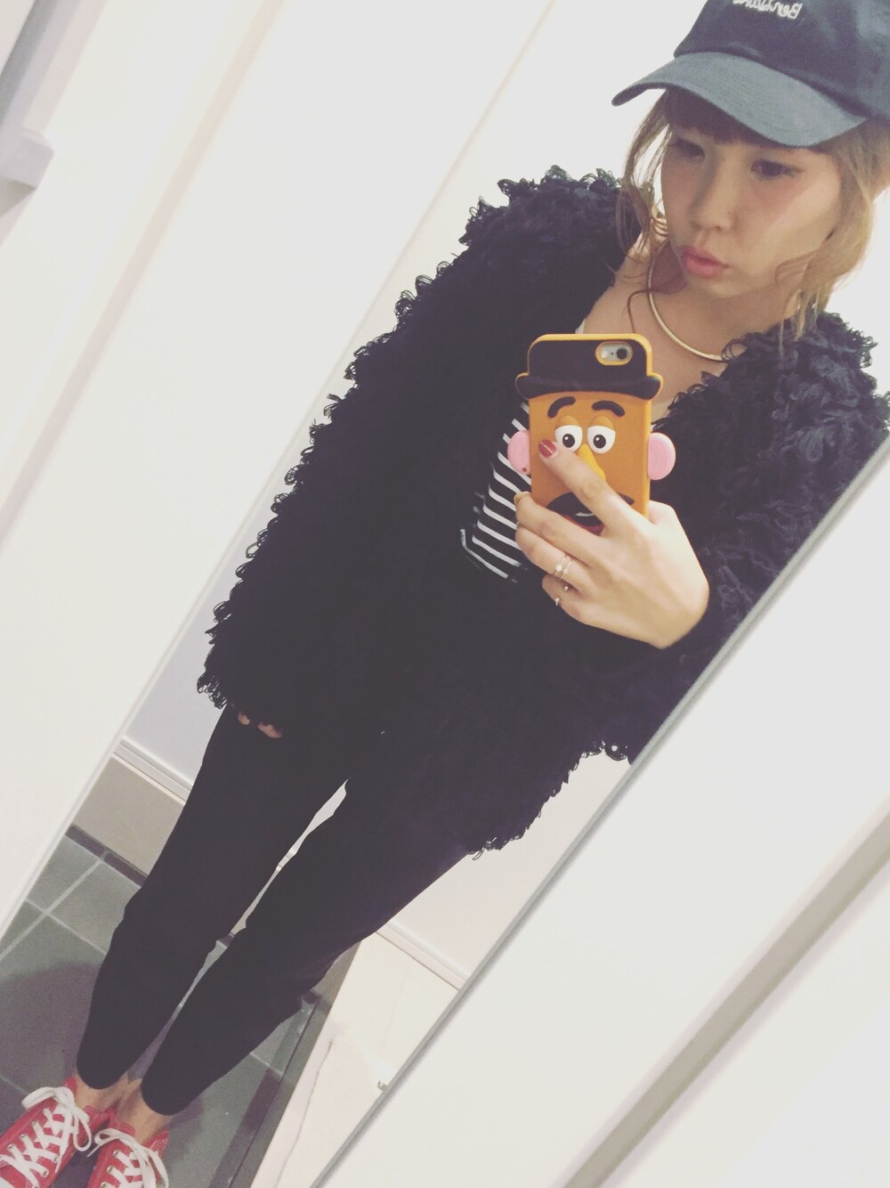 このループカーデお気に入りです♡ ブラックコーデに赤コンすきな組み合わせ٩(Ü*)۶