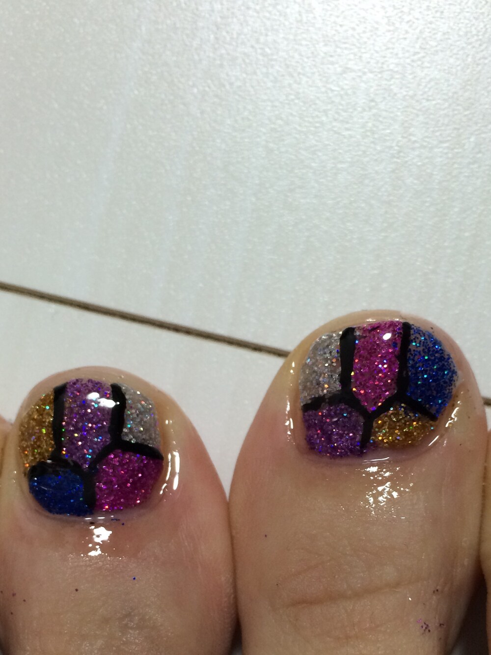 フットネイルはグラスネイルにしました。 が、もっと色んな色を使ってもっと分割してステンドグラスみたくしたかったけど、夜泣きに負けて簡単にしたら…カラフルな亀の甲羅見たくなっちゃった(¯―¯٥)