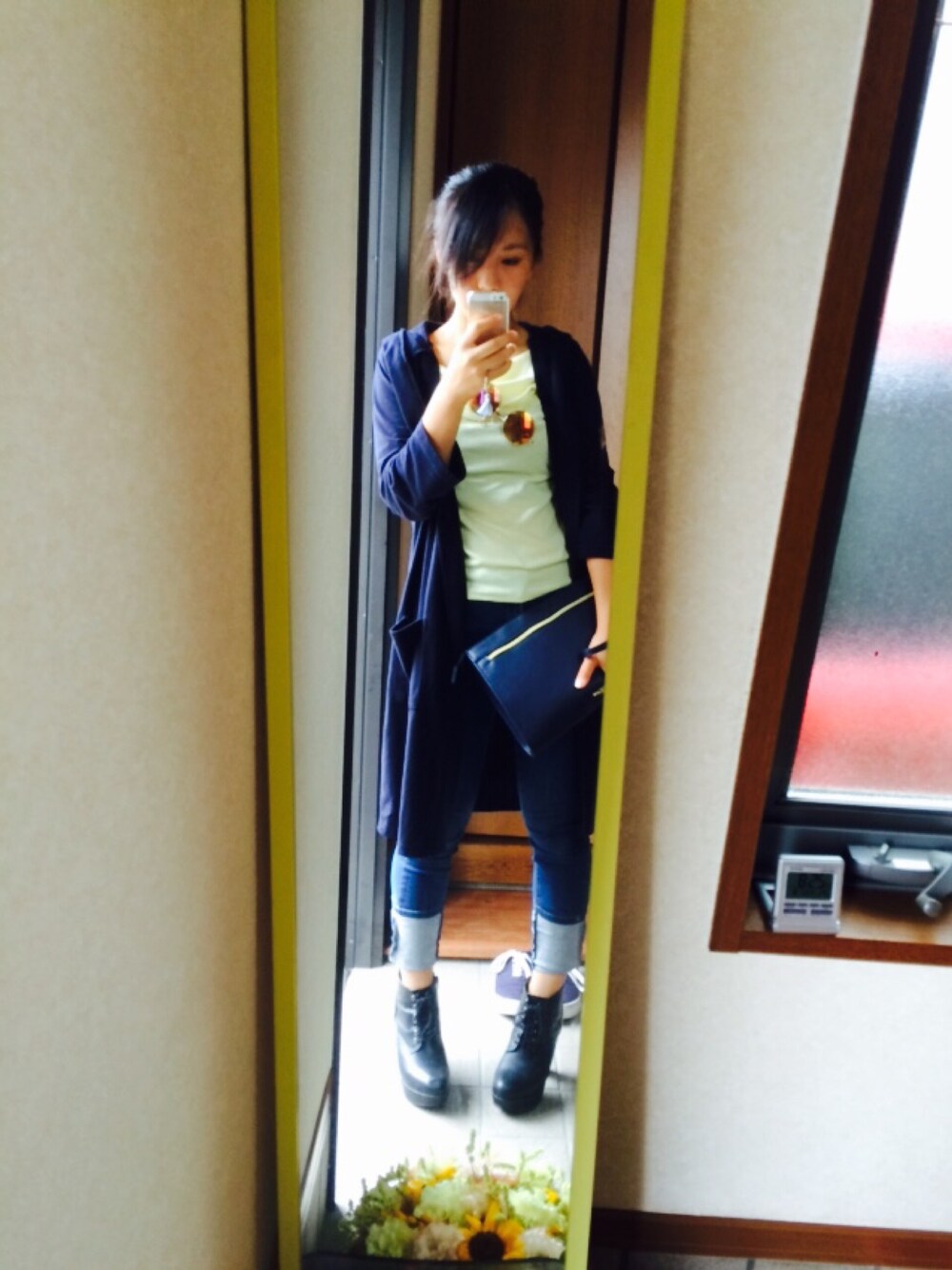 オールネイビーに イエロートップスの差し色 ちょっと気が早いブーツ💕
