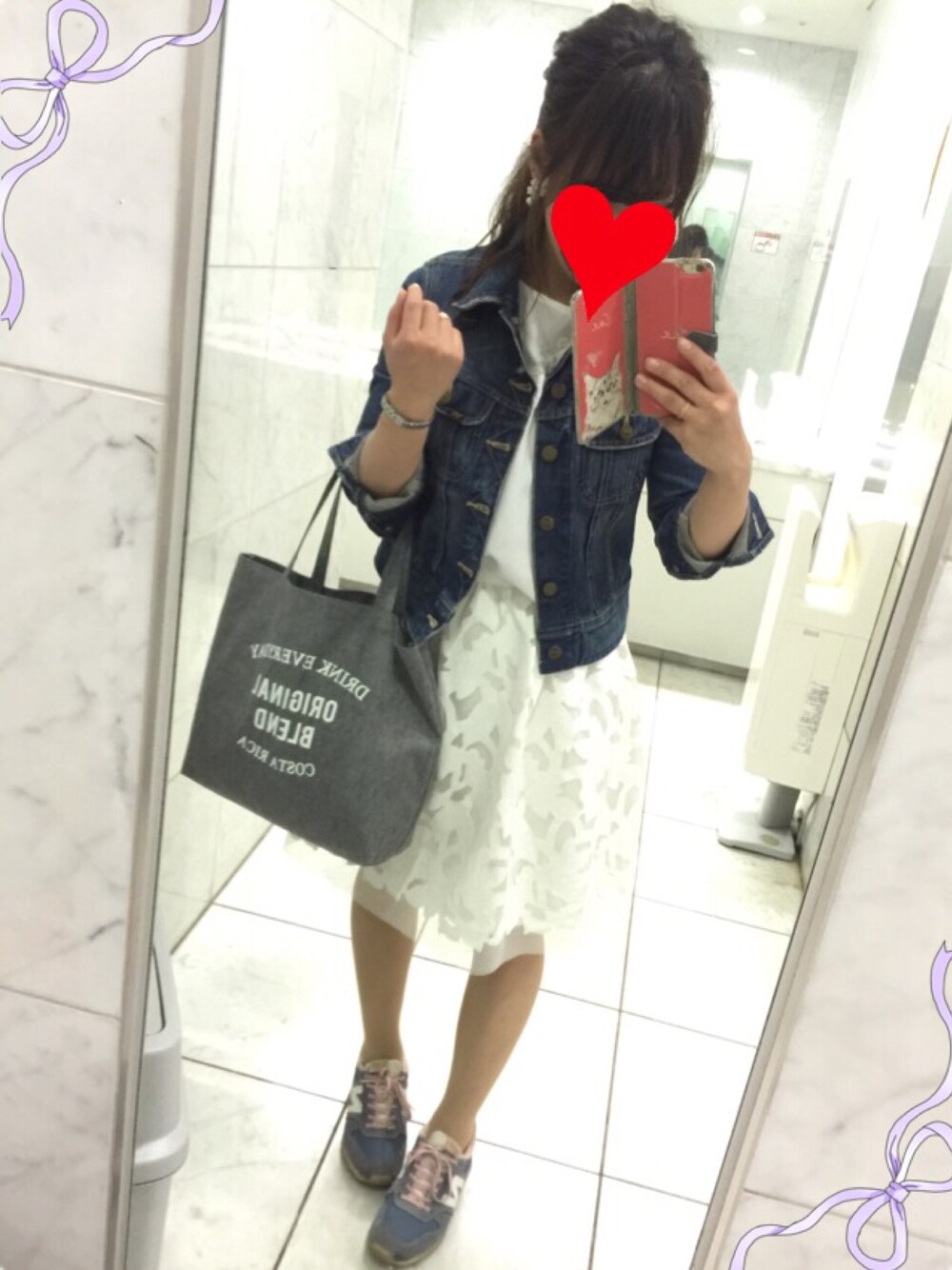 スニーカー×女っぽカジュアル レザーカットのスカートでオールホワイトにして、スニーカーとデニムジャケットをオンして、春コーデにしました\(^o^)/