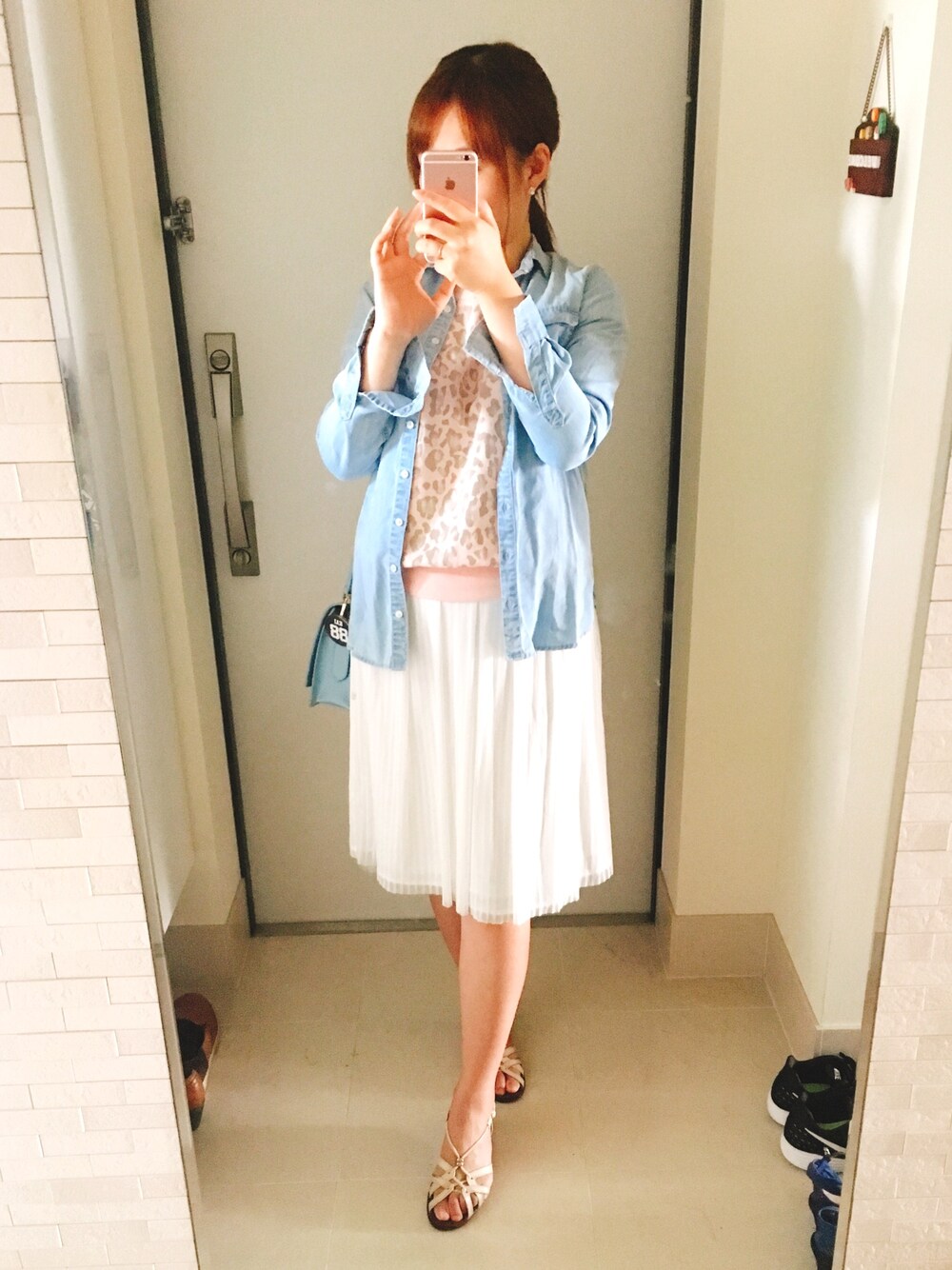 春の定番コーデ = デニムシャツ x ピンク x 白スカート♡