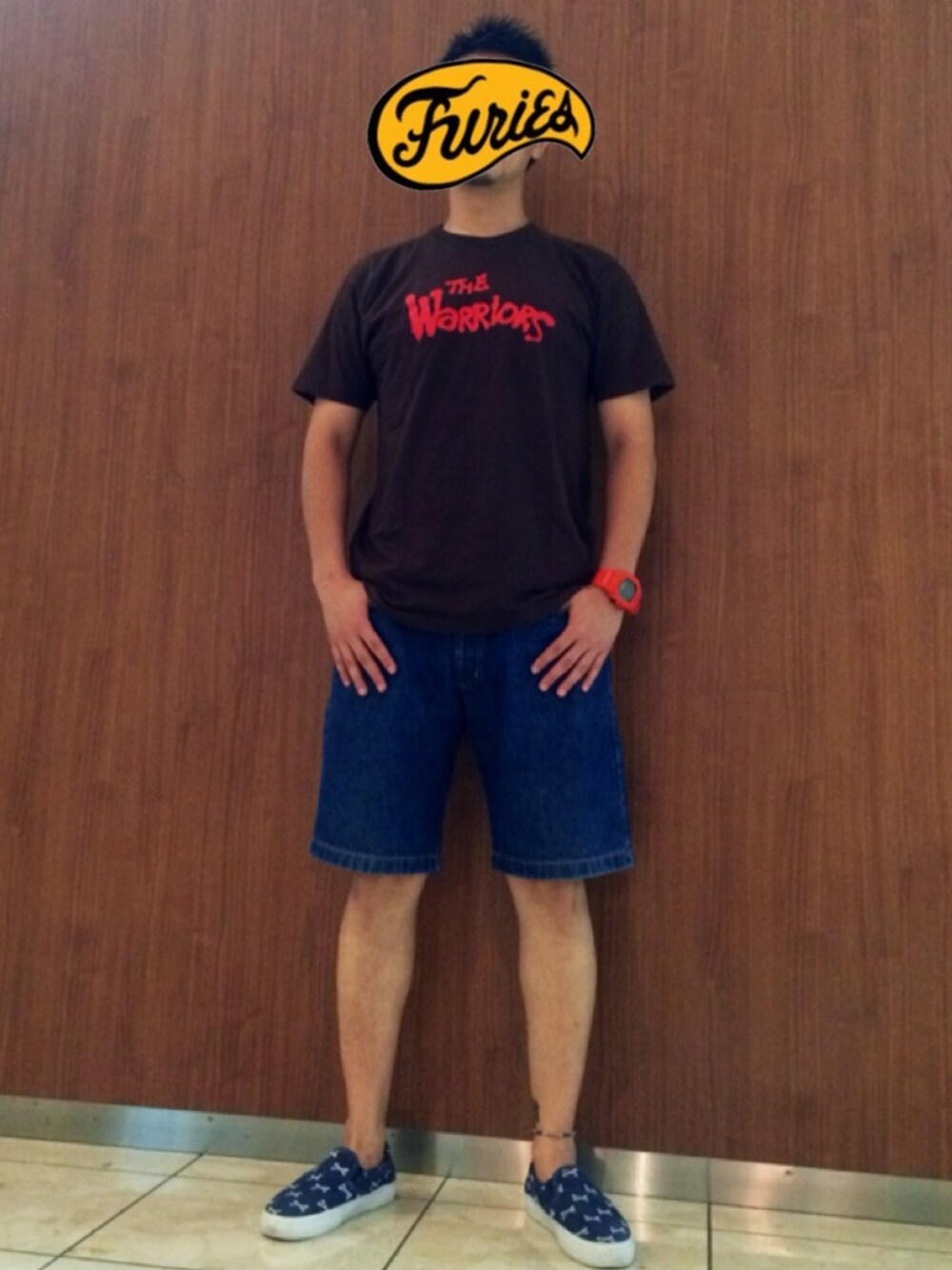 この日は、1979年のアメリカ映画" The Warriors "(ザ•ウォリアーズ)のTeeを着用。 The Warriorsは、数多くのアーティストやミュージシャンが愛する、ストリートギャングカルチャーのはしりとなる、30年以上前の映画です。 様々なギャングチームが登場し、それぞれがチーム独自のユニフォームに身を包んでいるので、ファッション的な観点からみても、とても興味深い映画だと思います。 ボスのRussはロシア移民なので、ロシア移民が多く住むブルックリンのコニーアイランドが地元であり、同じくコニーアイランドを根城とするウォーリアーズが好きでした。 個人的には、野球のユニフォームにフェイスペイントを施した極悪集団、"Baseball Furies"がお気に入りです。 オススメの映画なので興味があれば是非ご覧ください♫^ ^ ※以下Wikipediaから引用 ◆概要 アメリカ中を驚かせた問題作。 NYのスラム街のストリートギャング達がひたすらその逃げる姿に、アメリカ中の若者は熱狂した。 SFやNYにおいて、10代のストリートギャングによる殺人事件が起こり、サウスブロンクスでは抗争事件まで起こった結果、映画館は厳重な警備が施された。 全員無名のスター達がこの映画により成功を掴んだ。 ◆ストーリー 夏夜のNY。 何組ものギャングチームがブロンクスの公園に集結。ギャングの実力者でギャングチーム"リフス"のリーダーでもあるサイラスの召集を受け、集会が行なわれた。 ブルックリン•コニーアイランドを縄張りとする"ウォリアーズ"のメンバーもその集会に参加したが、サイラスが演説中に銃殺されてしまう。 "ローグス"のリーダーであるルーサーが、サイラスの死体のそばにいたウォリアーズが犯人であると叫び濡れ衣を着せる。 リフスはウォリアーズのメンバーに復讐するため、他のギャングチームにも指示をして、集会場所であるブロンクスから地元のコニーアイランドへ帰ろうとするウォリアーズを狙う。 各ギャングチームの追撃をかわしながら一夜の逃走を描いたアクション作品。 ◆登場するギャングチーム ■THE WARRIORS(ウォリアーズ) リーダーのクリオン中心9人組のギャング団。赤いベストが目印。 ■ROGUES(ローグス) リーダーのルーサー中心9人組のギャング団。黒いベストと帽子が目印。 ■TURNBULL AC´S(ターンブル エーシーズ) 100人以上いるギャング団。黒人と白人で全員スキンヘッドが目印。2台のバスに乗っている。 ■ORPHANS(オーファンズ) 30人いるギャング団。緑のTeeが目印。ギャング団の中では一番弱い。 ■BASEBALL FURIES(ベースボール フューリーズ) 野球のユニフォームとペイントメイクが目印。バットで戦う。 ■THE LIZZIES(リジーズ) 全員女性のギャング団。一見普通の女性に見えるが、実は危険な集団。パンクスとは仲間。 ■THE PUNKS(パンクス) 青のつなぎと天然パーマの髪が目印。大柄の者が多い。リジーズとは仲間。 ■GRAMERCY RIFS(グラマシー リフス) リーダーはサイラスとサブリーダーのマサイ。一番強い集団。サイラスの死後マサイがリフスのリーダーとなる。100人以上おり格闘技の様な服を着ている。 ■HURRICANES(ハリケーンズ) 揃いの帽子が目印。 ■BOPPERS(ボッパーズ) 黒人で紫のベストと帽子が目印。 ■HI-HATS(ハイハッツ) 黒いシルクハットと赤い服とピエロのメイクが目印。 ■ELECTRIC ELIMINATORS(エレクトリック エリミネーターズ) 黄色のジャンパーと後ろのマークが目印。 ■SAVAGE HUNS(サべージ ハンズ) 中国系で緑の服と帽子が目印。 ■MOONRUNNERS(ムーンランナーズ) 黒人で紫の服とその下に赤い服が目印。 ■SARACENS(サラセンズ) 黒のタンクトップが目印。 ■SATANS MOTHERS(サタンズマザーズ) 黒いベストと後ろのサタンが目印。 ■JONES STREET BOYS(ジョーン ストリート ボーイズ) 黒と黄色のTeeが目印。 ■VAN CARTLANDT PAMGERS(ヴァン カートランド パンジャーズ) 白と黒のTeeが目印。 ■BOYLE AVENUE RUNNERS(ボイル アヴェニュー ランナーズ) 黒と赤のタンクトップが目印。 ■GLADIATORS(グラディエイターズ) 黒のYシャツが目印。 ■PANZERS(パンサーズ) 全員黒人で軍服が目印。