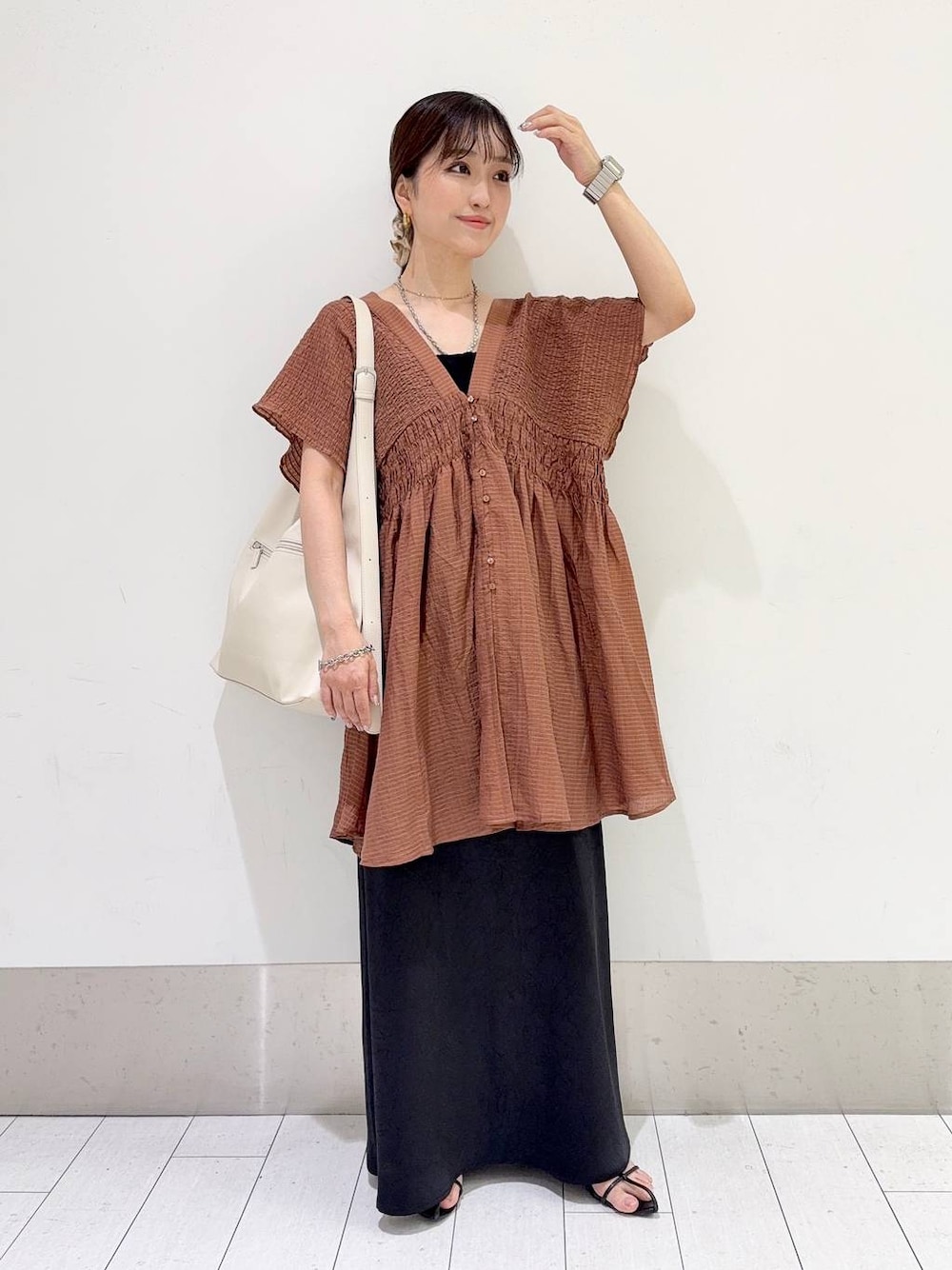 【夏コーデ】 着用アイテムをタグ付けしているので スライドして見てね♩ ブラウス▶︎▶︎フリーサイズ着用 シャーリングのデザインが可愛いく、 深いVネックで首元もスッキリ◎ さらっと着れる素材感で、 腰回りもカバーしながら合わせて頂けます/ スカート▶︎▶︎Sサイズ着用 フレアシルエットのスカートは、 Sサイズからあるので小柄さんでも穿きやすいアイテムです◎ やや丈感は長めでシワ加工されたサテン生地が よりお洒落見えするスカートです/ 着回しや色違いコーデも沢山載せてるので見てね♩ インスタではリアルバイコーデを載せてるので のぞいてみてね♡ Instagram▷▷@_anyu325