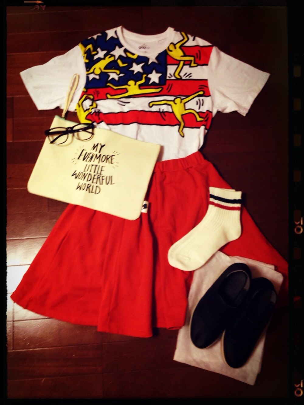 Tシャツ*UNIQLO スカート*Soadalite ド派手な組み合わせなので、クラッチとインヒールスリッポンですこーしでもカチっとした感じを入れてみました☺︎ ラインソックスもはまってます(*´_ゝ`) ついつい集めちゃう( ゚д゚ )