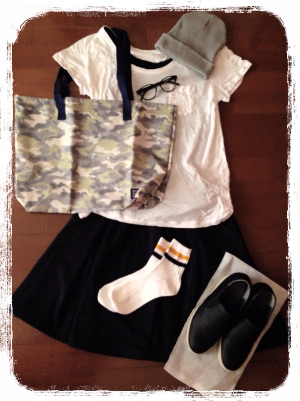Tシャツ*UNIQLO スカート*Soadalite 小物が付録づくし! 迷彩アイテム気になりますよねー。 カバンかスカート欲しいなぁと思いつつ、なかなか決断できない( ゚д゚ ) ので付録でしばらくいってみようと思います☺︎