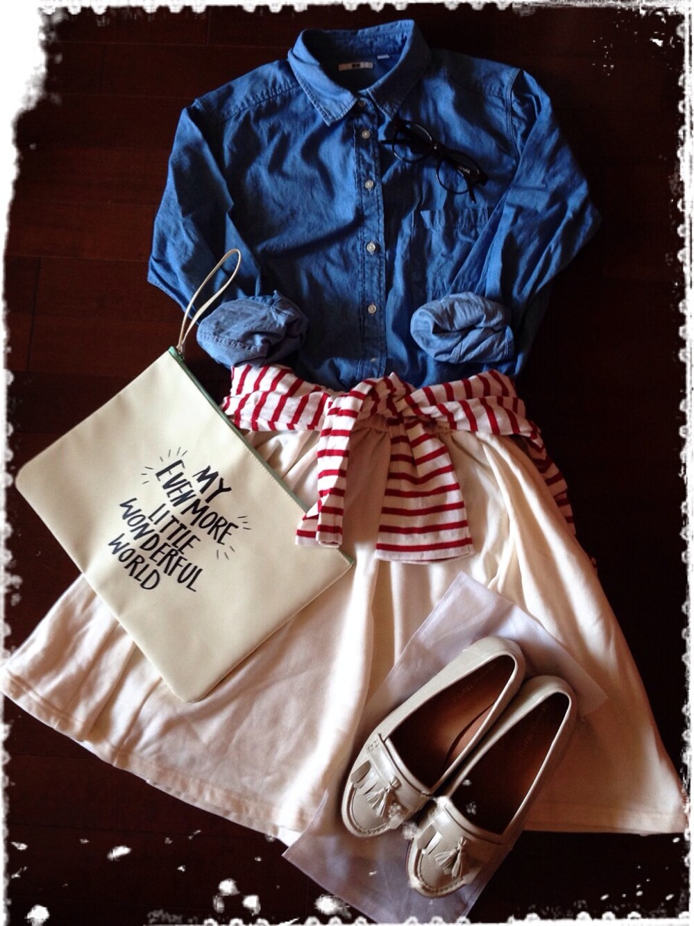 シャツ、Tシャツ*UNIQLO スカート*Soadalite シンプルコーデに赤ボーダーの腰巻きをポイントに☺︎ 白アイテムが増えてついつい合わせちゃいます( ゚д゚ )