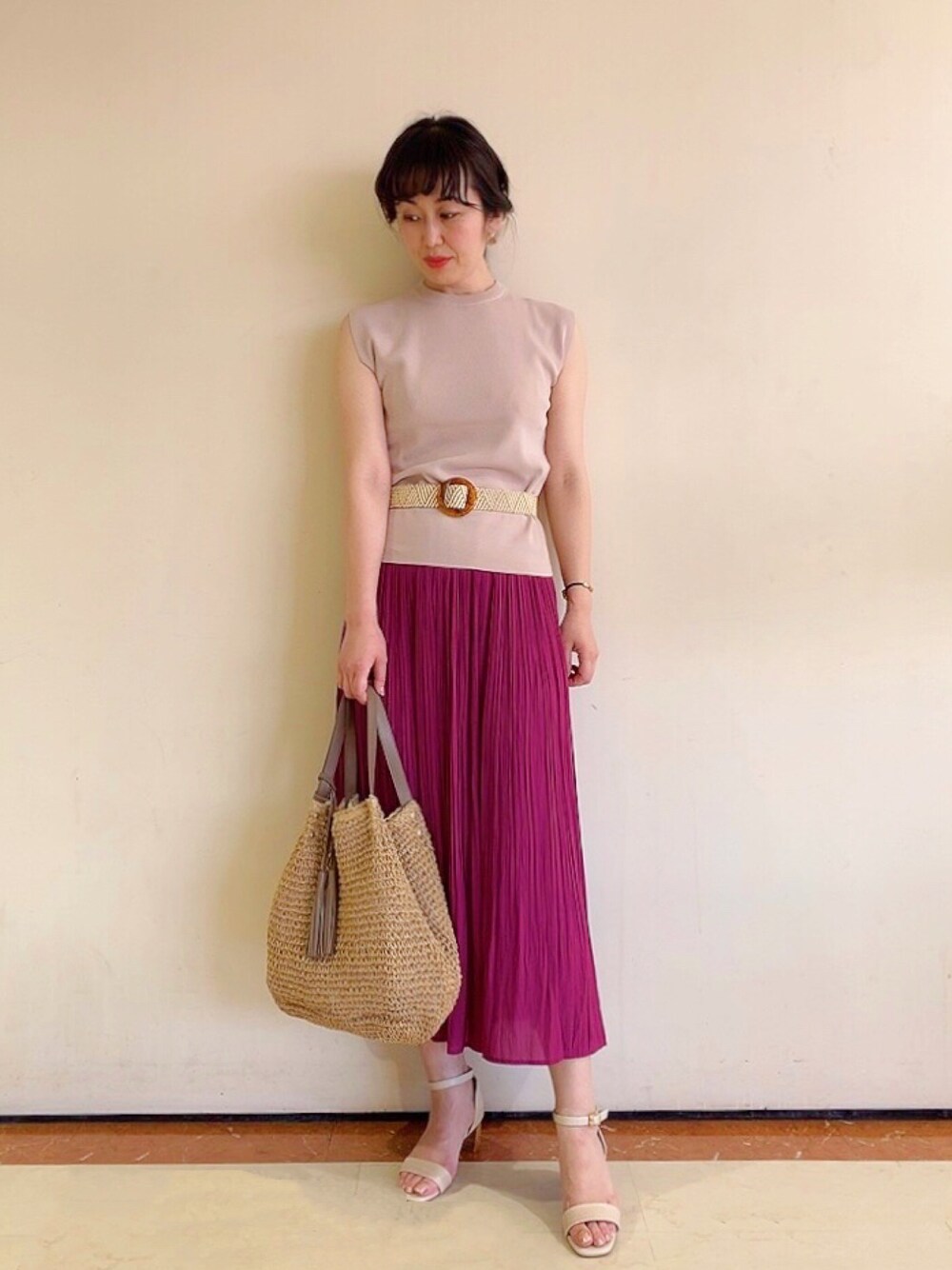 スカートが鮮やかなピンクなのでトップスはベージュを選びました^ ^ 華やかなお色の洋服はボトムで取り入れるとチャレンジしやすくオススメです^ - ^ 小物は淡い色にするとスカートの鮮やかさを抑えてくれます。