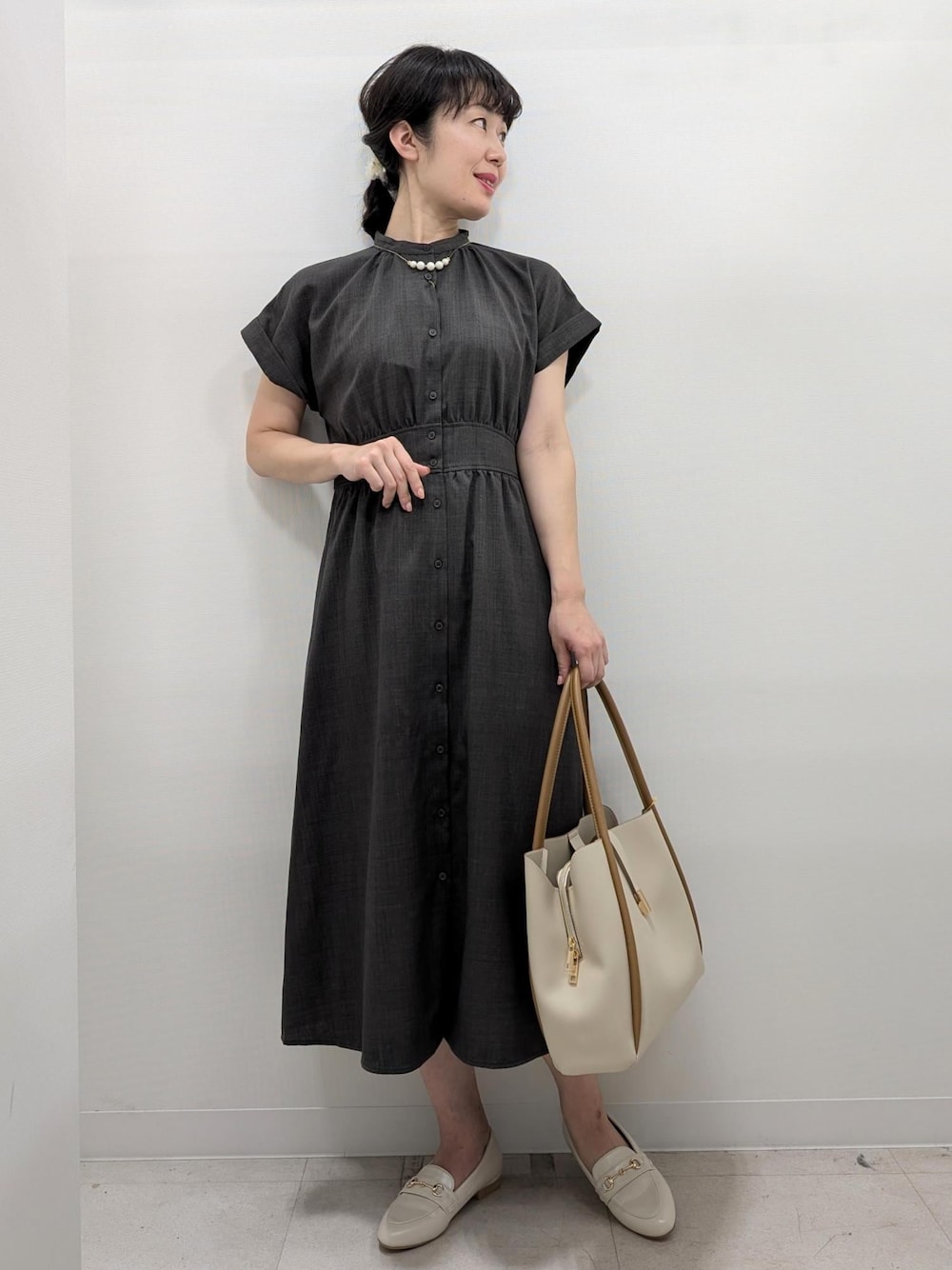 ワンピースがダークカラーなので襟元にネックレス、小物はアイボリーで統一して軽さを出しました(^.^) ジャケットを羽織って10月まで長く着られるコーディネートです!