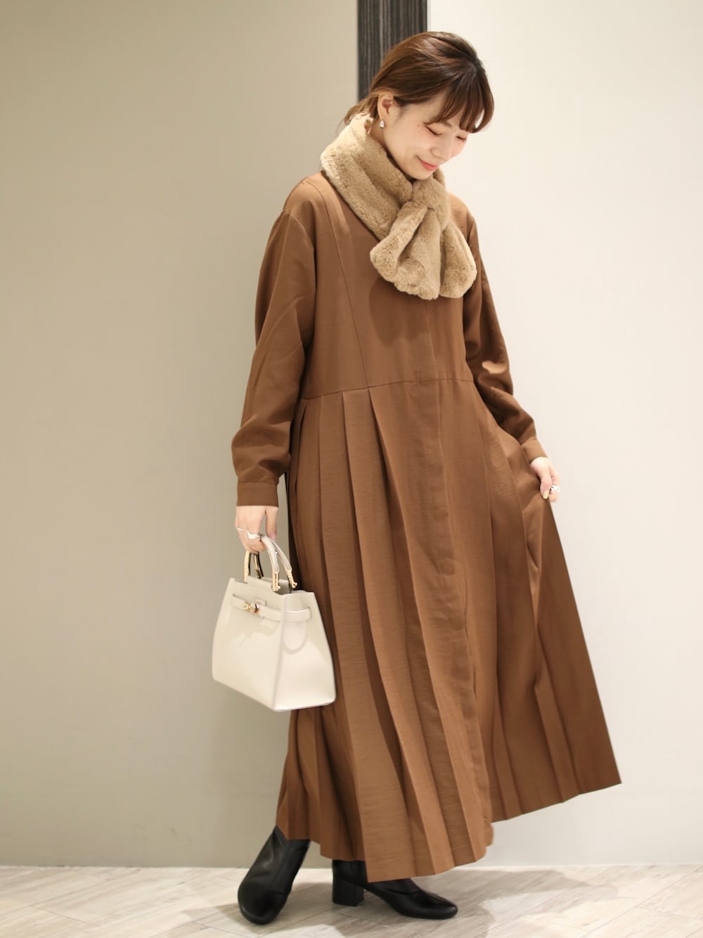 anzu(SMELLY)のワンピース「プリーツ切替ワンピース」を使ったコーディネート