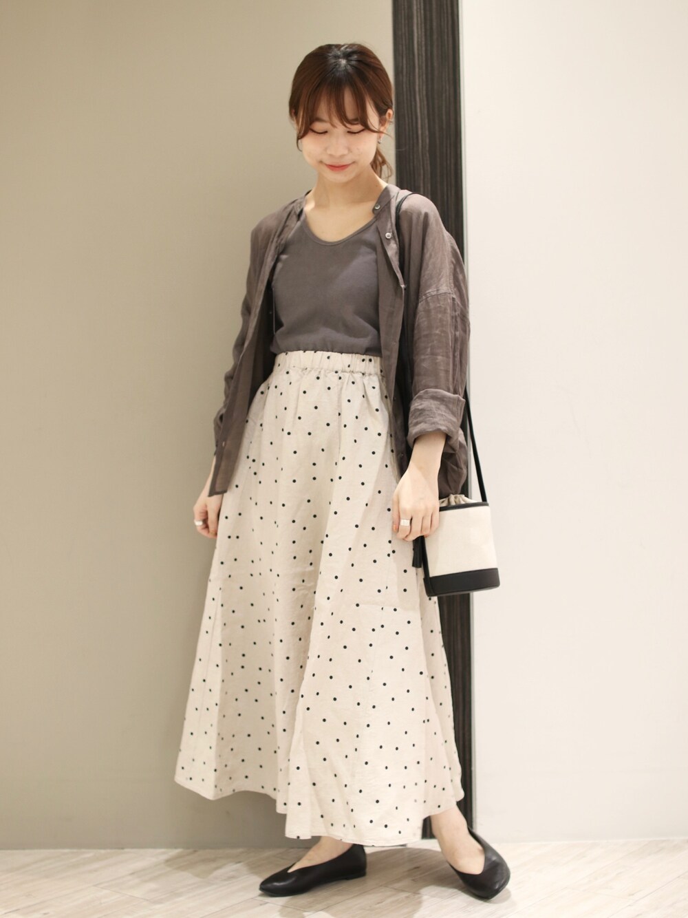 ドットのスカートが大人カワイイ! 細かいドットなので派手すぎず、またリネン素材がナチュラルな雰囲気に抑えてくれます◎ Instagram ▶︎ @anzu_amesoda