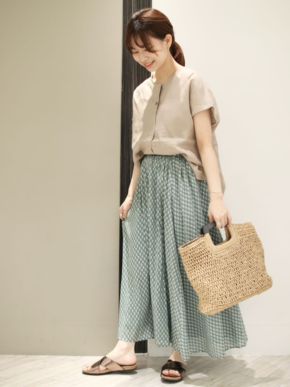 小紋柄のスカートがナチュラルな雰囲気でかわいい◎ トップスはリネンで涼しげに! Instagram ▶︎ @anzu_amesoda