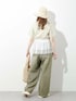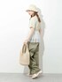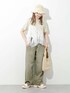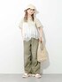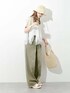 カットソーなのに簡単にオシャレ見えするKBFのTシャツ! シアー素材のフリルがデザインされていて、この一枚だけでとても映えるアイテムです! だぼっとしたシルエットがかわいいデニムは 他ではあまりないカラーがこなれた雰囲気でお気に入り。 夏らしい素材のバッグと帽子を合わせて、この季節ならではのスタイリングにしました◎