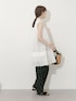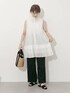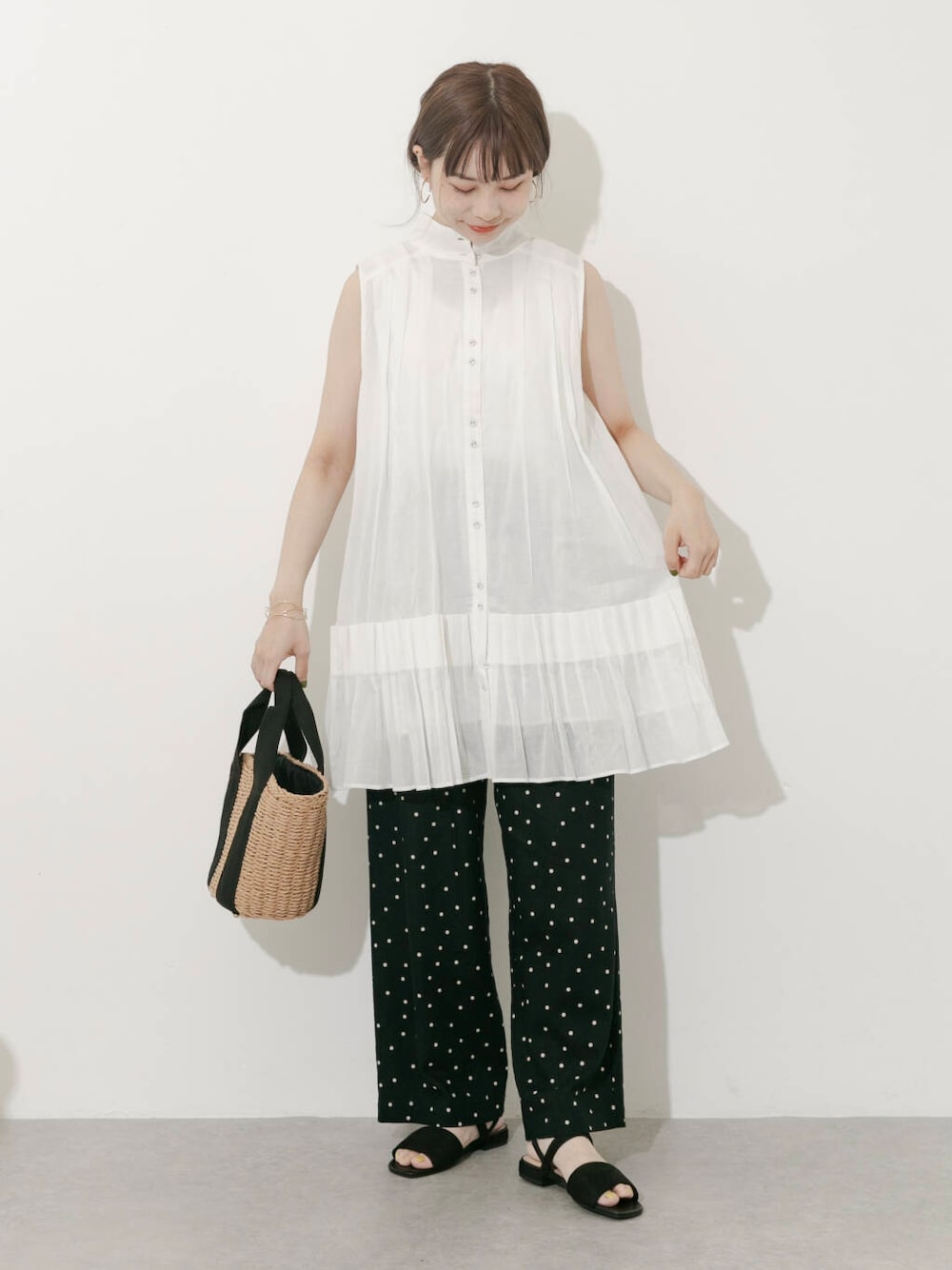 裾のプリーツデザインが可愛いミニワンピースと ドット柄がコーデのアクセントになるパンツを合わせた大人カジュアルスタイル。 ミニワンピはハイネックのデザインが品のある印象で ふわっと軽やかな素材が夏らしい一点です。 派手になりすぎない小粒のドット柄が上品で、ほんのり可愛らしさもプラスできるイージーパンツは ウエスト周りの締め付け感もなく、とても快適です!