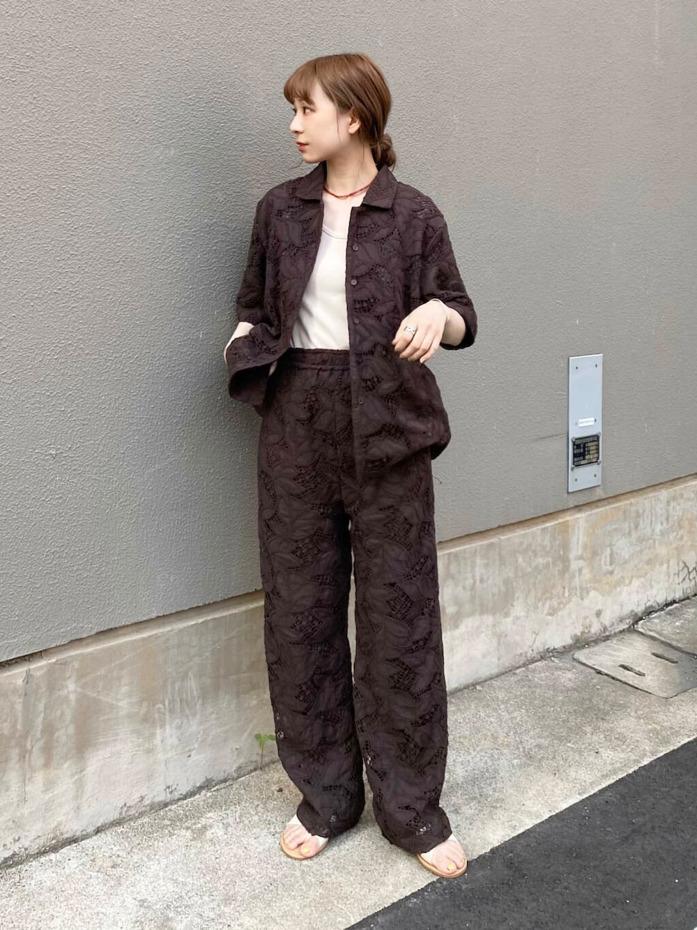 簡単にオシャレ上級者になれるセットアップスタイル。 レースもブラウンをチョイスすれば大人っぽい雰囲気で使えます◎ SMELLYsoのカーネリアンネックレスは、 コーデに添えるだけで一気に垢抜けた印象になり、 さりげない差し色としてもおすすめです!