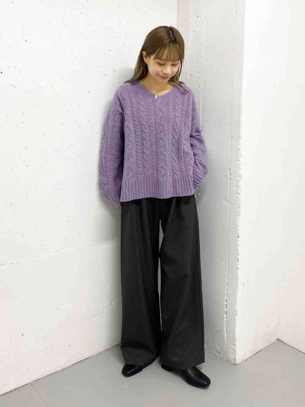 毎年人気のハミルトンウールのニットが主役のスタイリングです! アラン柄の編み目が冬らしい雰囲気ですが、分厚すぎない軽やかな印象のニットなので きれいめにも取り入れやすいアイテムです! 絶妙なくすみパープルも大人っぽくて◎!