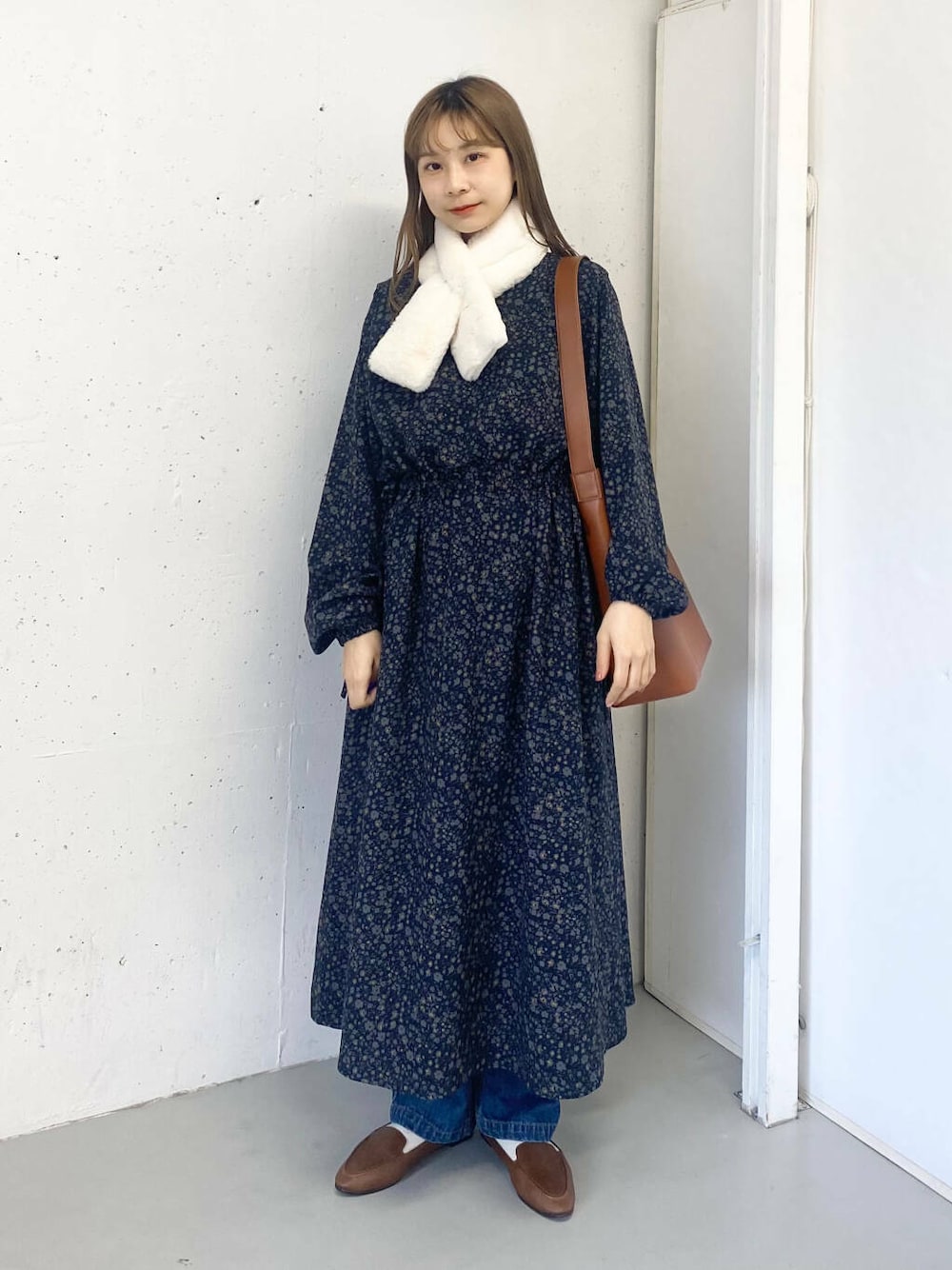 きれいめにもカジュアルにも使える 花柄のワンピースをコーディネート。 今回はデニムを重ね着して 少しカジュアル要素をプラスしてみました。 ワンピースはウエストを絞れる仕様なので 体型に合わせてバランスよく着ることができます◎ シックな配色の花柄なので 甘い雰囲気になりすぎず、大人っぽく取り入れることができますよ^^