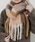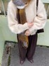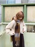 チェックのマフラーをポイントにしたブラウンコーデ。 マフラーはふっくらとした厚みがあり、顔周りをしっかり包めてとても暖かいです。派手すぎない配色がコーデの差し色にも使いやすいです! フワフワのニットカーデも冬の雰囲気にピッタリでかわいいです。