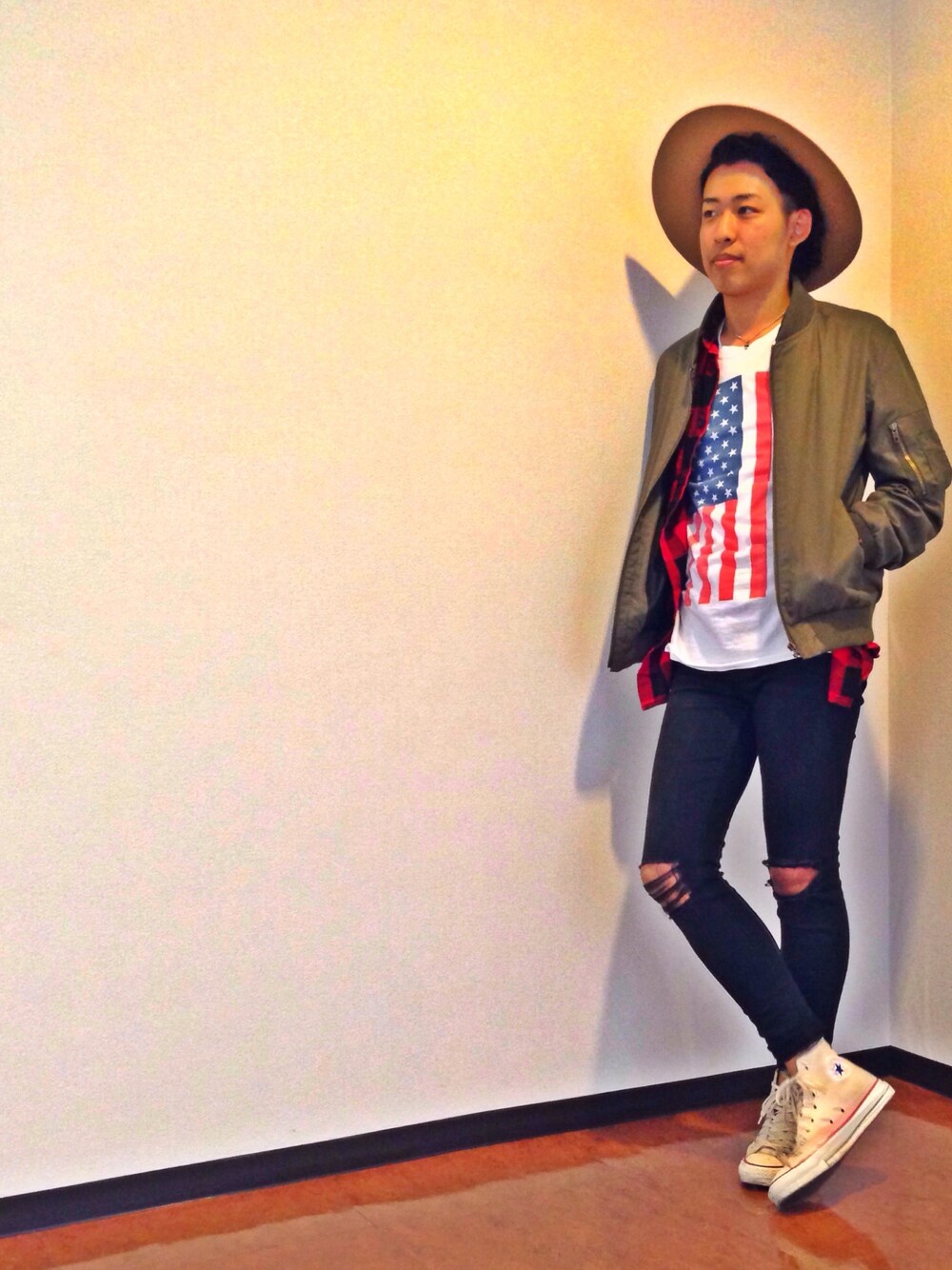 こんにちは! メリークリスマスイヴですね🎅🌲 今日のコーディネートです♪ テーマは”LAスタイル”です!笑 全体的にアメカジ感を出す コーデを意識しました(*^^*) 星条旗柄が二度目の登場なんですが 今回は別ブランドのTシャツです♪ アメリカンアパレルは凄くシンプルで デザイン性が海外系なので すごくオススメブランドです(≧∇≦) ズボンはH&Mのレディース用の ズボンです!笑 最近のレディースパンツは履きやすく シルエットも綺麗でオススメですよね(*^^*) 靴はアメカジ王道のコンバース! どんな服装にも合うので大好きです😆👍 いいね、コメントお願いします!れ