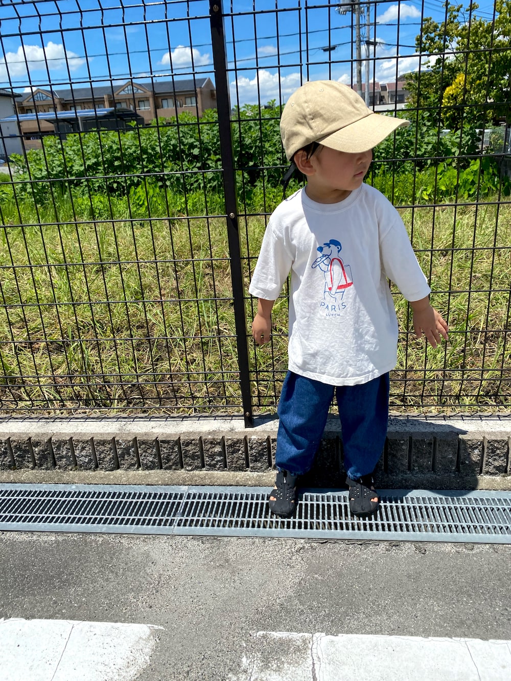 ホワイト系のトップスを着用したキッズの秋コーディネートの1枚目の写真