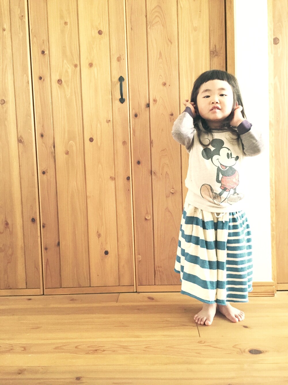 全身 姉の お下がりコーデ。 正確には スカートは まだ お下がりではない。 120の姉が膝上ではいてるスカートです(ˊᵕˋ) 今日は 姉が履いてたのを 妹が 奪いました。