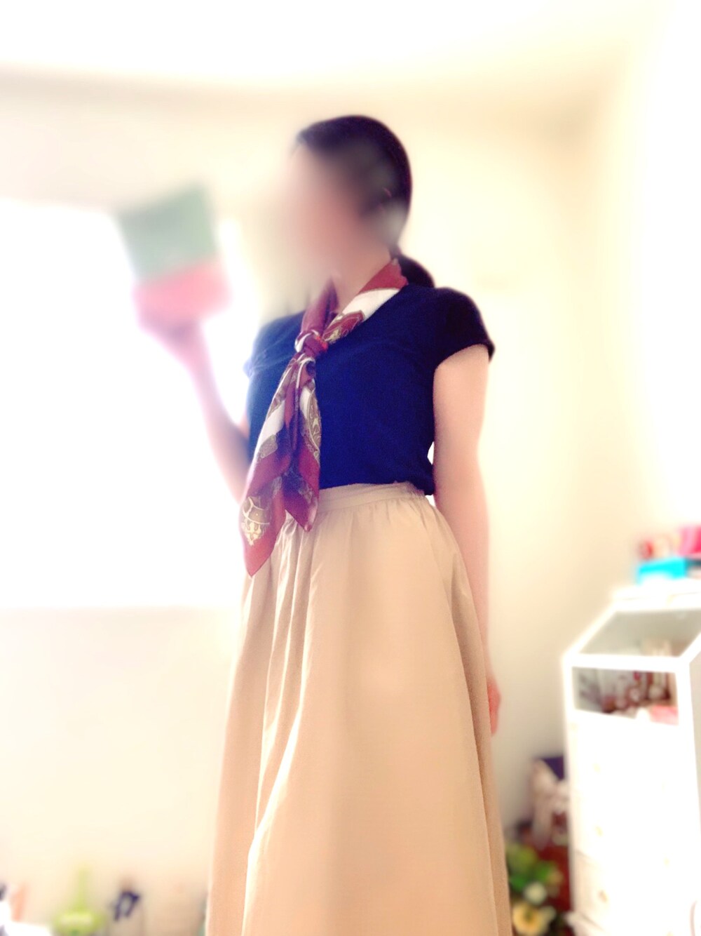 ご覧くださりありがとうございます(*^▽^*) 今日はスカーフを使ってみました。 赤っぽいスカーフとブラウンのスカーフがあったのですが、このスカートにはブラウンの方が合うかなっと思ってこれにしました。 スカーフの結び方色々覚えたいです(^^)