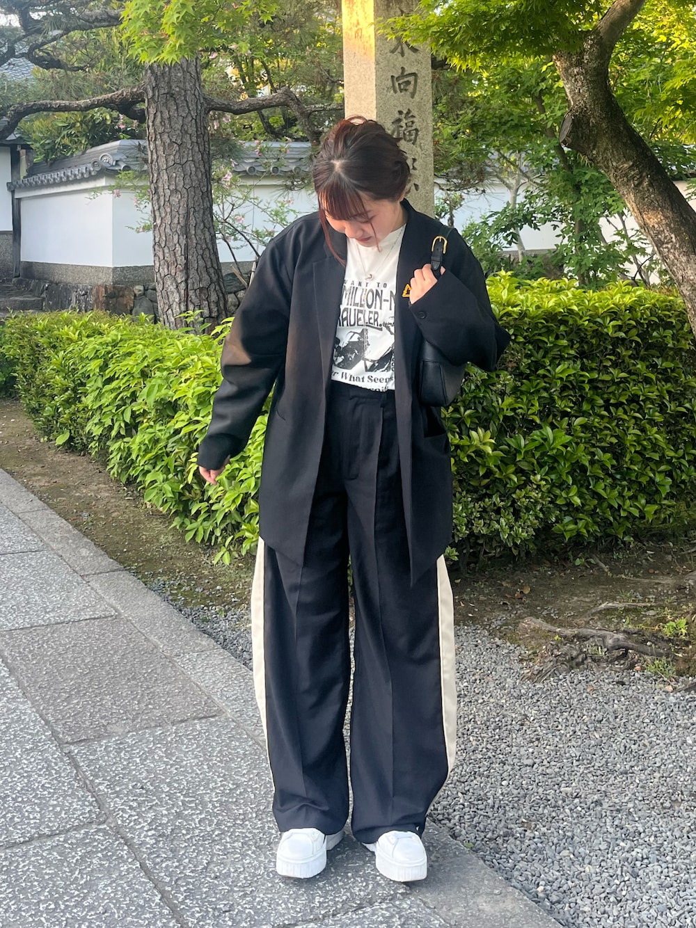 お気に入りの黒ジャケットにラインパンツはタックの部分が 歩く度にコーデのアクセントになって可愛い🪽✩.*˚ Instagram:@__ao8gram