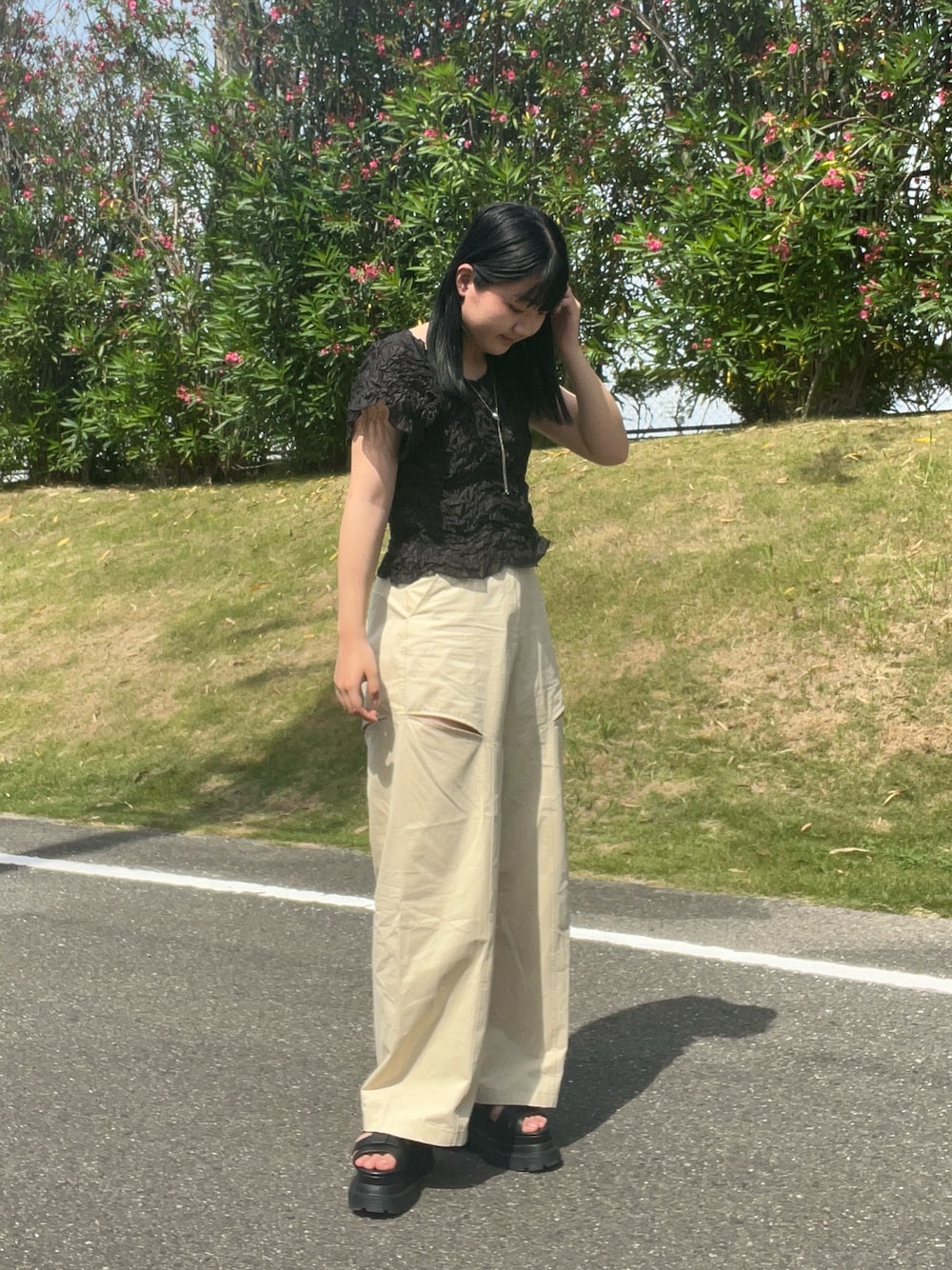 去年愛用したシャーリングブラウスにサイドカットパンツで 少しカジュアルさを足してみた🫶🏻 Instagram:@__ao8gram