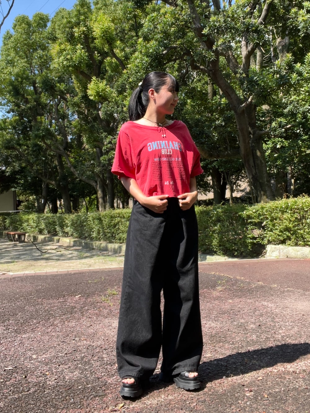 赤Tシャツにタックワイドデニム合わせが最近のお気に入り! チョーカーはリボンアレンジにしてみた🎀 Instagram:@__ao8gram