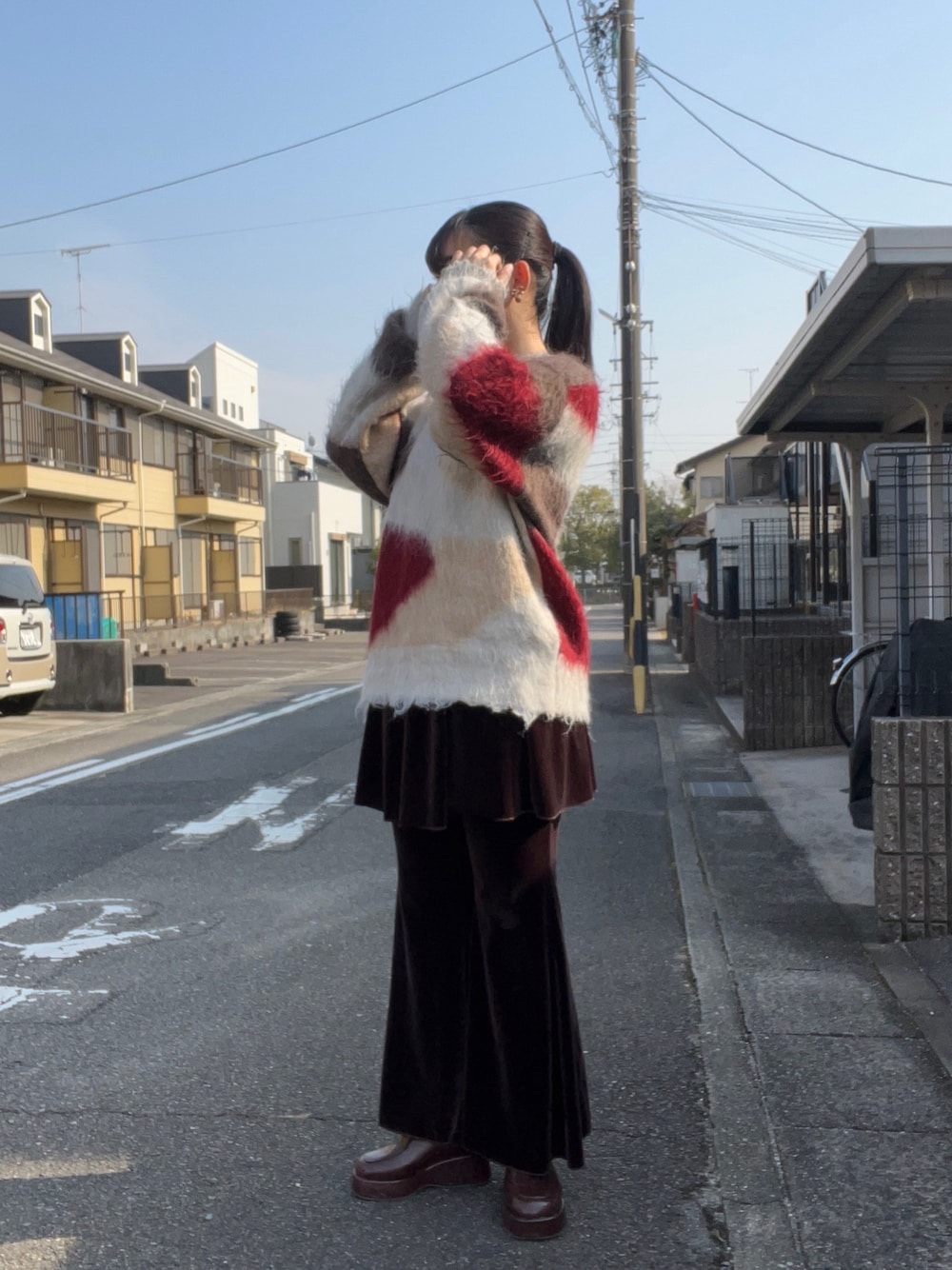 シャギーニットは色合いがドタイプで着ただけでコーデ完成!ベロアパンツとのレイヤード合わせが1番しっくりきた❤️‍🔥 Instagram:@__ao8gram
