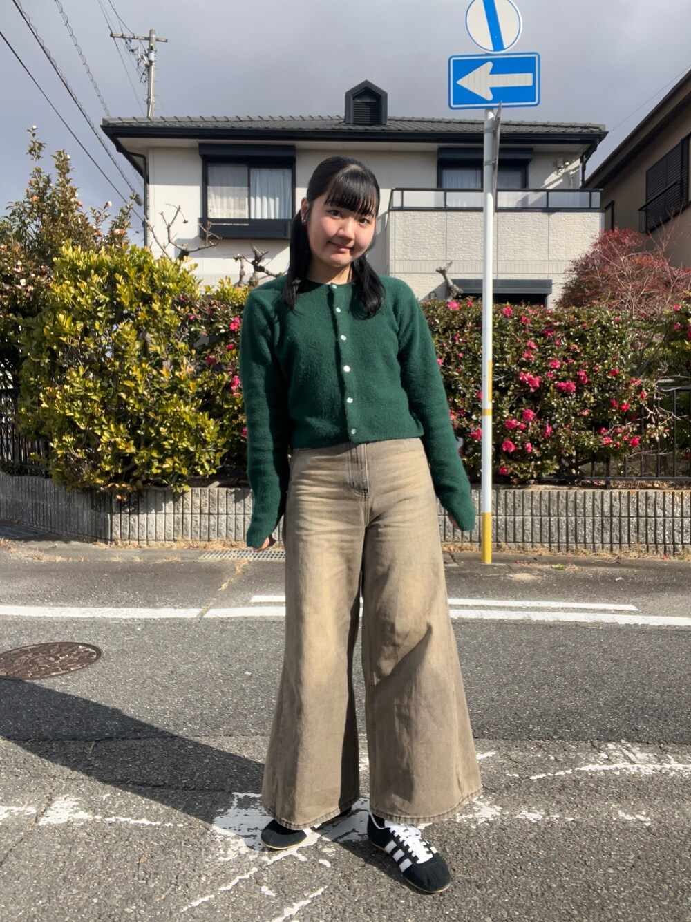 ロゴ刺繍が可愛いカーディガンはグリーンに!💚 履いただけでスタイルが盛れるフレアデニムが最近の推し^_^ Instagram:@__ao8gram