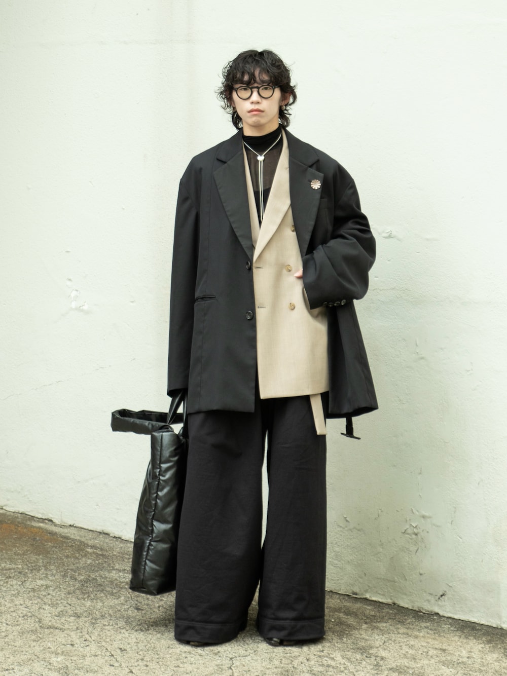 クラシカルなダブルジャケットとオーバーサイズのシングルジャケットを使ったレイヤードスタイル