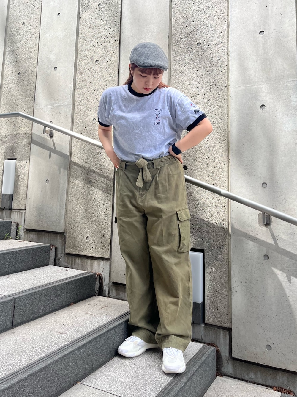 Tシャツのカラーに同じグレーのハンチングを合わせました⭐︎ グレーはどんなコーデにも馴染んでくれて万能です!!! カーゴパンツのウエストの紐が可愛くてお気に入りです〜🔆