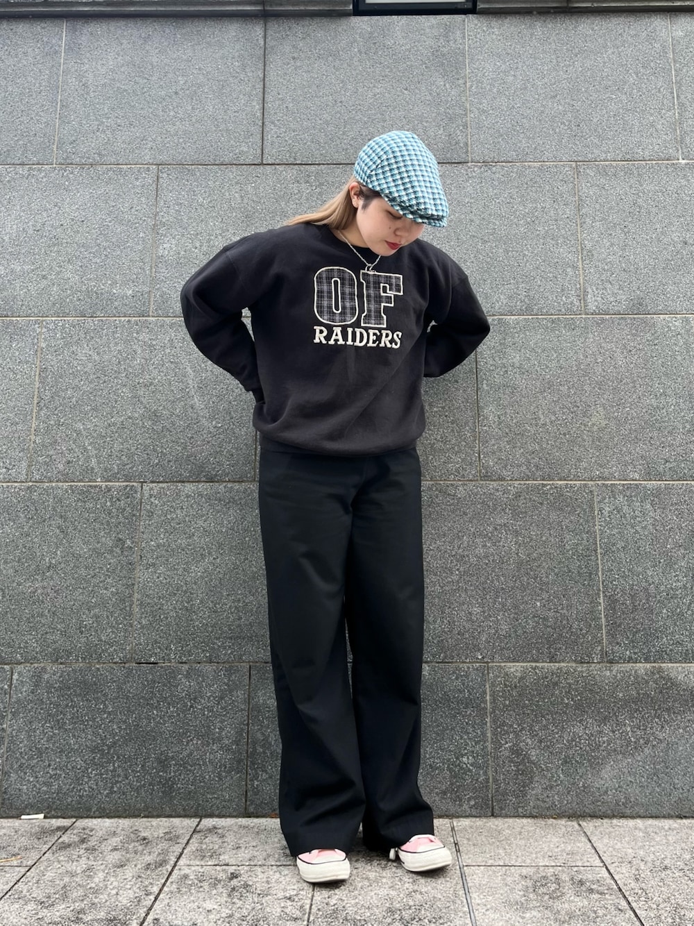 ブラックコーデに靴と帽子でカラーを入れてアクセントにしました︎︎︎︎⭐️ チェックのハンチングデザインもカラーもとっても可愛いです🩵