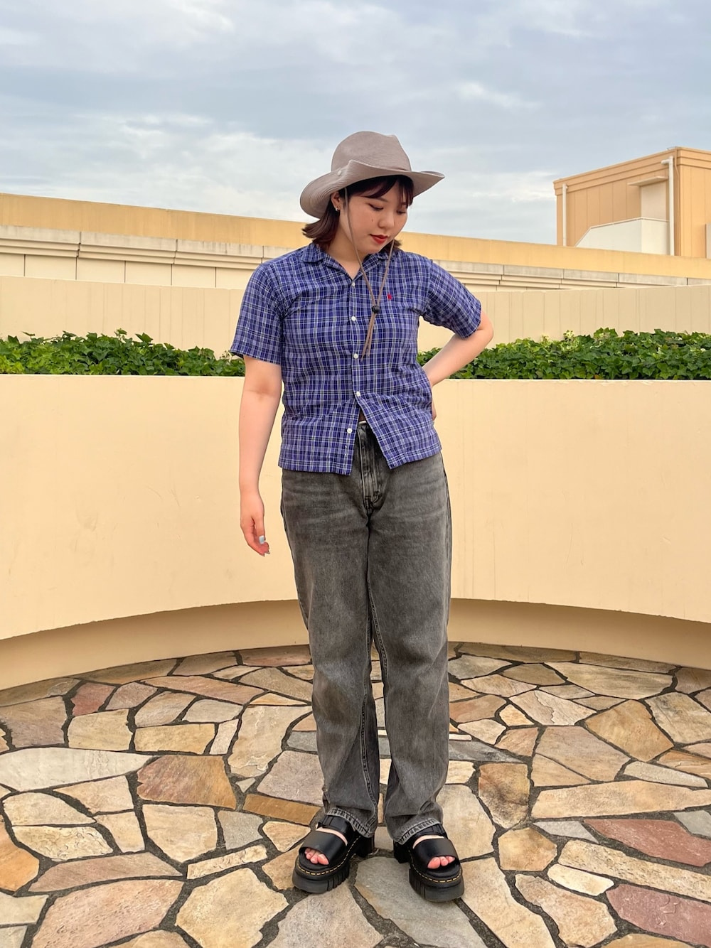 テンガロンハット⛰️ お気に入りの紫チェックのシャツにグレーのパンツと帽子で合わせました🩶