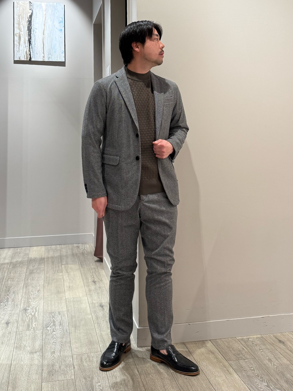 ao(アバハウス 佐野プレミアムアウトレット店(MEN'S))のテーラードジャケット「【セットアップ対応】ヘリンボーン ジャガード ニットジャケット」を使ったコーディネート