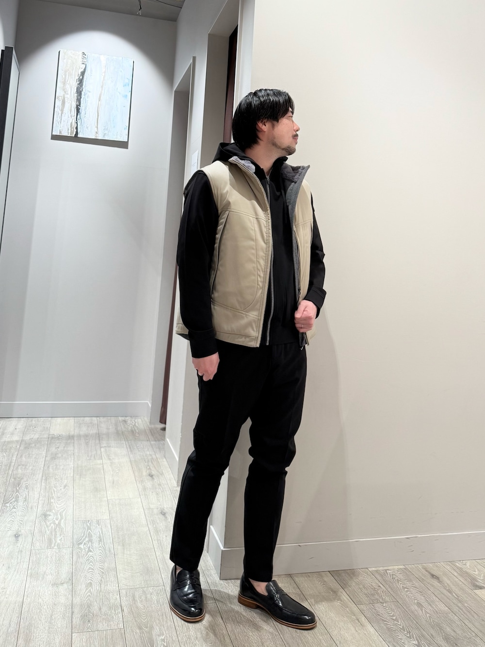 中綿ベストにパーカーセットアップで スポーティぽいですがエレガント♪