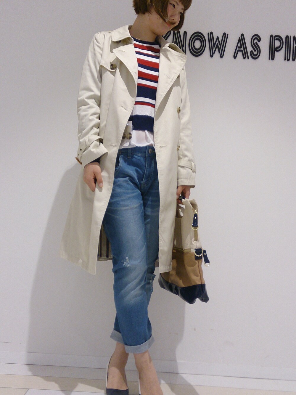 春といえば着たくなるトレンチコート!! 履き心地抜群のクラッシュデニムとトリコロールニットで大人可愛い春マリンコーデ◎