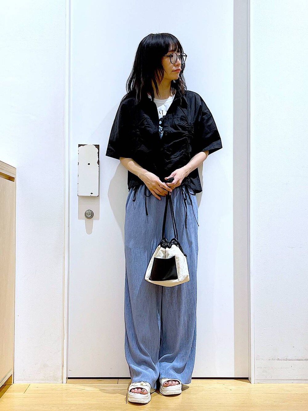 あおき@LAKOLE海老名(LAKOLE イオン相模原ショッピングセンター)のショルダーバッグ「フロントフェイクレザーポケット巾着ショルダーバッグ / 108020」を使ったコーディネート