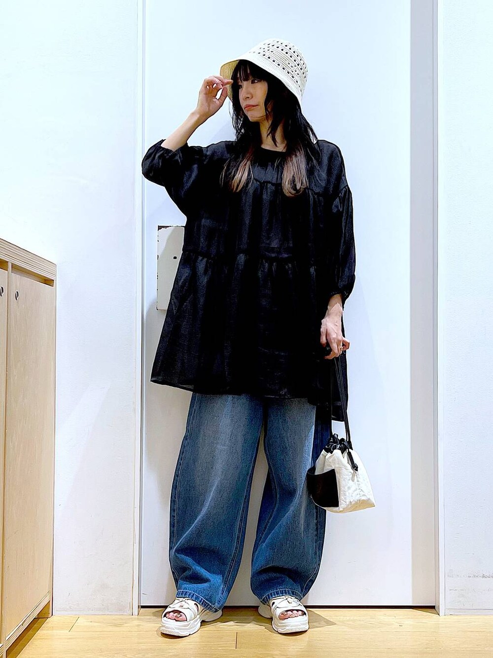 あおき@LAKOLE海老名(LAKOLE イオン相模原ショッピングセンター)のショルダーバッグ「フロントフェイクレザーポケット巾着ショルダーバッグ / 108020」を使ったコーディネート