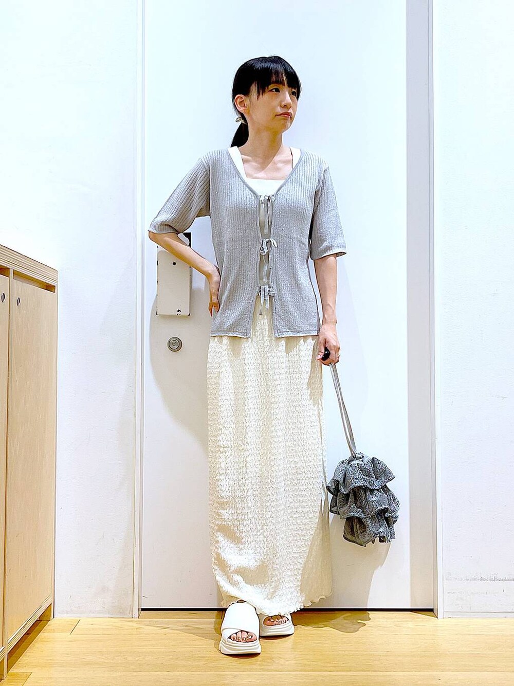 あおき@LAKOLE海老名(LAKOLE イオン相模原ショッピングセンター)のショルダーバッグ「ラッフル巾着2WAYショルダーバッグ / 104949」を使ったコーディネート