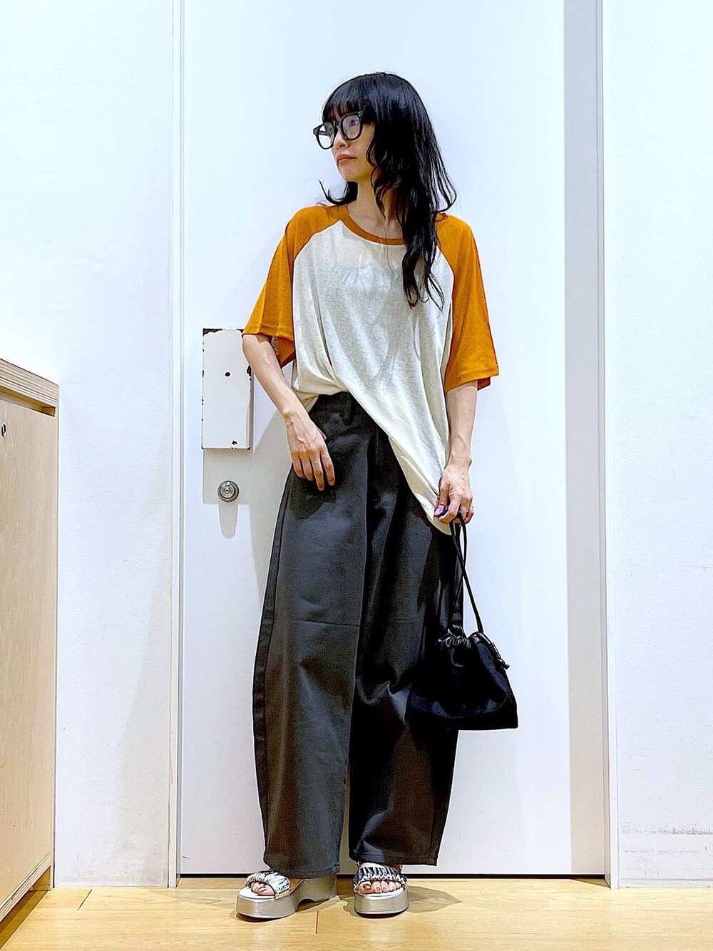 あおき@LAKOLE海老名(LAKOLE イオン相模原ショッピングセンター)のショルダーバッグ「フロントフェイクレザーポケット巾着ショルダーバッグ / 108020」を使ったコーディネート