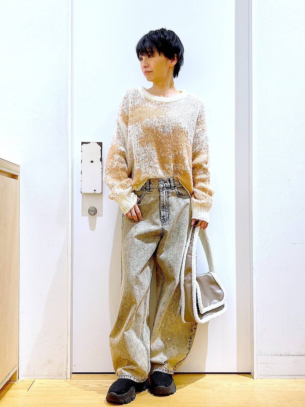 ご覧いただきありがとうございます** ◇ニュアンス柄ニットプルオーバー◇ Sサイズを着用しております♪ 柄がとってもオシャレでインパクトがあるニットです◎フワッと軽い着心地と、首まわりもゆとりがあるのでレイヤードスタイルにもオススメです!!サイズで着丈に差があるので、お好みの丈感でスタイリングしてみてはいかがでしょうか♡ 各アイテムのアップ画像や全角度、動画も載せています☺︎ ぜひお試しください**