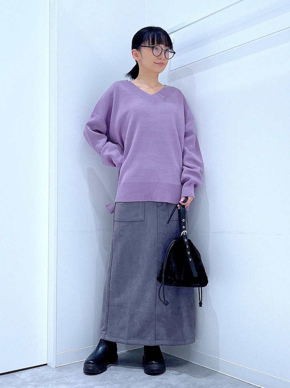 あおき@LAKOLE海老名(LAKOLE イオン相模原ショッピングセンター)のハンドバッグ「アイレット×ファー巾着バッグ / 579033」を使ったコーディネート